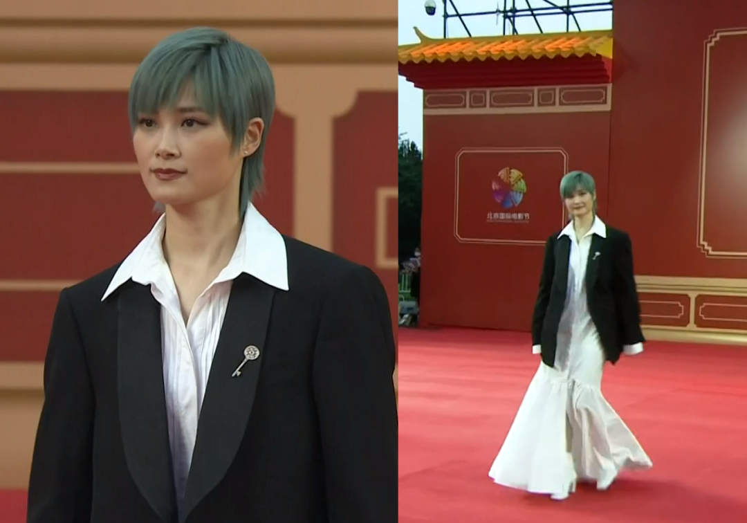 对造型一直比较有想法的李宇春,红毯上顶着一头绿发,以黑色外套配鱼尾裙的搭配闪亮登场。