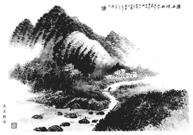 米点皴分为大米点皴和小 米点皴两种。凡画雨景之山宜以大米点皴法。首先用中锋笔以提按、断续简要画出山石起伏轮廓,略 皴擦,然后按笔排列依序皴出山石的明暗、凹凸关系。米点皴是浑点,大小相间,可从山顶往下皴 点,也可从山脚向上皴点。米点皴一般皴一二遍即可,太多容易死滞。皴米点时要有整体感,笔墨要 流畅,要有干湿深浅墨色变化,最后随着皴笔的明暗关系加以渲染。染时要有深浅虚实,达到浑厚迷蒙的效果。小米点皴画法 和大米点皴画法基本相 同,只是点稍小些,宜作 雨雾之图。作小米点皴法 时,要点得湿润,有浓有 淡,潇洒生动,不板不 刻,用笔苍劲,骨肉分 明,笔笔生烟。
