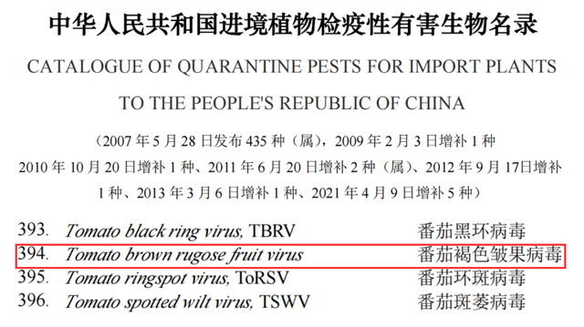 2019年,山东发现国内首例ToBRFV,发病率达50%,其后短短4年不到的时间内,陕西、江苏、北京、云南、河北、河南、安徽等地相继发现该病毒;国内关于ToBRFV最近的一次公开报道是2022年3月,6吨从中国出口至俄罗斯的新鲜辣椒在边境口岸被查出ToBRFV。