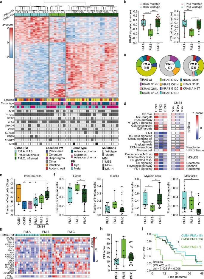 CRC-PM患者在病情进展速度和症状方面存在显著的临床差异。考虑到CMS4腹膜样本的转录谱存在广泛的异质性,研究团队评估了多个CMS4亚组存在的可能性(图3)。最终,共发现3个具有不同分子和临床特征的CMS4亚组(CMS4-PM.A、B和C)。突变分析显示,CMS4亚型内存在高度的异质性。CMS4-PM.A显著富集KRAS突变;CMS4-PM.B中来源于粘液性原发肿瘤的病变富集,且TP53突变的频率相对较高;CMS4-PM.C是高免疫浸润亚组,偏向网膜作为转移部位。