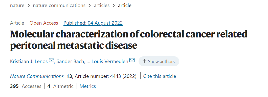 近日,荷兰阿姆斯特丹大学研究团队在Nature Communications上发表了题为“Molecular characterization of colorectal cancer related peritoneal metastatic disease”的文章。研究团队对52名CRC-PM患者进行了深入的分子表征,证明虽然CRC-PM是一种异质性疾病,但CMS4是其主要亚型。与肝转移相反,PM与原发癌密切相关。研究团队还将结构蛋白Moesin的表达定义为CMS4亚型的特异性决定因素,其使CRCs扩散到腹膜。在CMS4-PM患者中,研究团队确定了具有不同分子和临床特征的3个亚组,以及可捕获CRC-PM的临床异质性,有助于指导未来的CRC治疗发展。