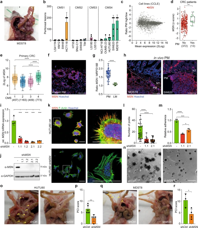 在体内腹膜肿瘤中,MSN蛋白的表达在肿瘤边界最为丰富,尤其是肿瘤细胞与周围组织相互作用的地方。功能上,MSN参与细胞对细胞外基质成分的粘附,MSN敲除后会导致体内PM的形成减少,但并不影响体外生长或体内皮下肿瘤的生长速度。综上所述,腹膜传播过程中需要CMS4相关的MSN表达。