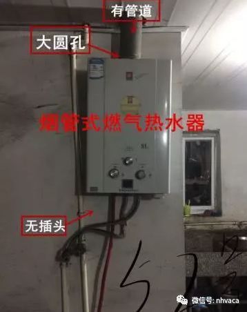 若是顶部有一个大圆孔,又没有外接插座的,那么这就是烟道式燃气热水器,若是未接通烟道,则需限期整改。