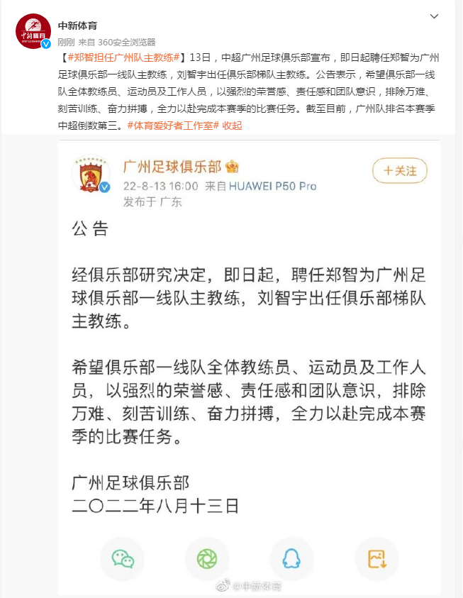 13日,中超广州足球俱乐部宣布,即日起聘任郑智为广州足球俱乐部一线队主教练,刘智宇出任俱乐部梯队主教练。公告表示,希望俱乐部一线队全体教练员、运动员及工作人员,以强烈的荣誉感、责任感和团队意识,排除万难、刻苦训练、奋力拼搏,全力以赴完成本赛季的比赛任务。截至目前,广州队排名本赛季中超倒数第三。