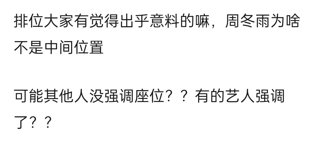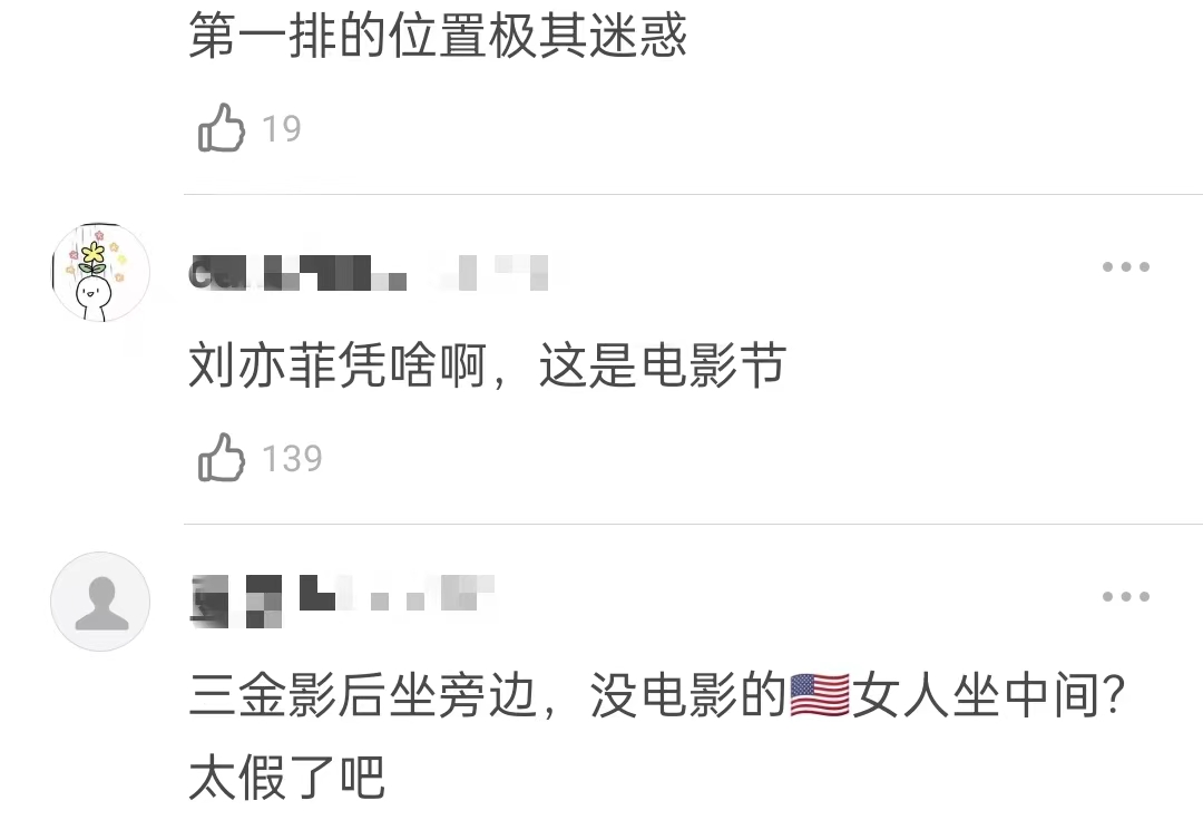 在活动正式开始之前,网上就已经传出当晚内场的座位表。表中显示微博之夜的内场座位从左到右分成ABC三个区域,B区域就是备受瞩目的中心区域了。根据表中信息,刘亦菲和李冰冰、李宇春并列稳坐第一排C位区域,谢霆锋、姚晨等人分列左右,朱一龙、李易峰等流量小生则“退居二线”,周冬雨、王一博等人更是直接被分到了旁边的区域。有不少网友表示:这可是电影节,怎么也要看看奖项和实绩,这么安排有点迷惑吧?