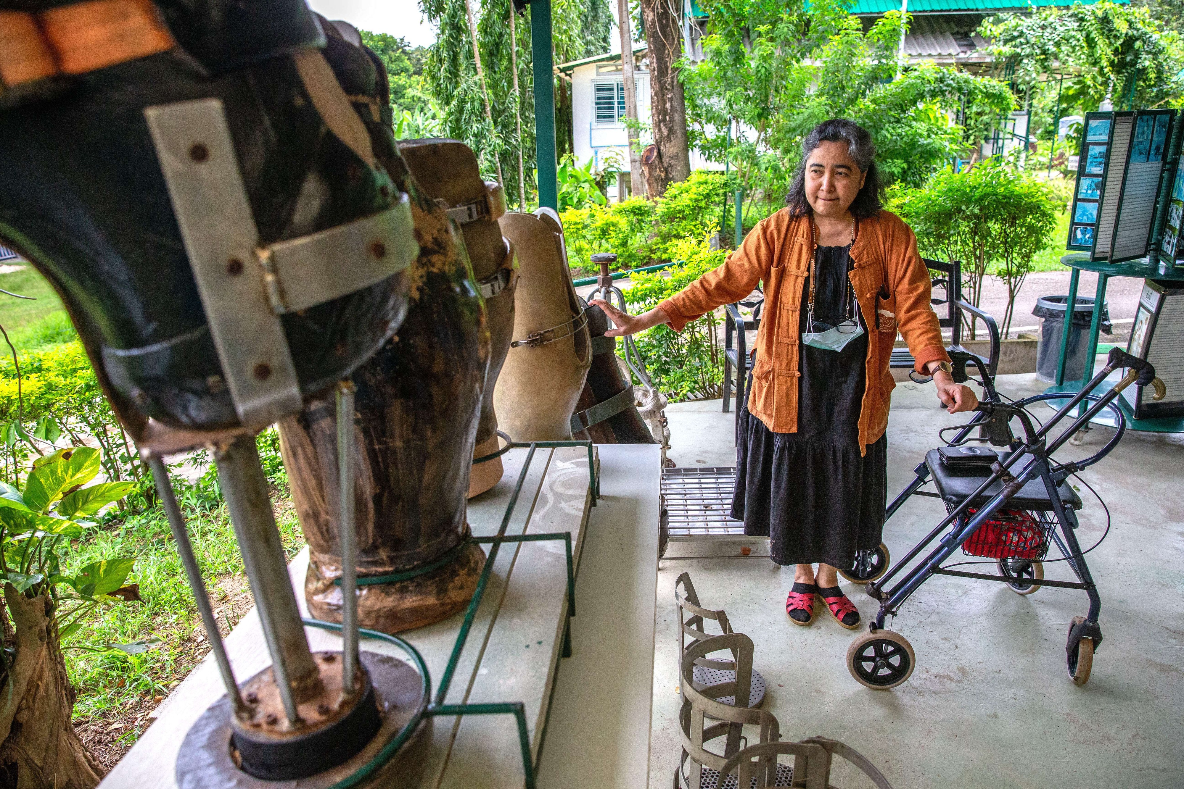 8月6日,在泰国南邦府“亚洲象之友”大象医院,苏赖达·萨瓦拉介绍为大象制作的假肢。新华社记者王腾摄