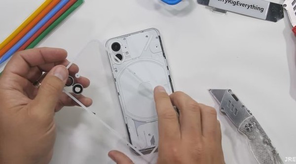 通过拆解视频我们可以看到,Nothing Phone(1)背面的所有部分都是由覆盖整个设备背面的塑料板组成,其上的Glyph灯组是由数百个微小的独立LED灯组成的,通过胶粘剂拉片将这些灯与导光板粘合在一起,然后在通过螺丝与背板连接。胶粘剂拉片的使用使得更换磨损的电池变得容易,LED灯、按钮和端口等个别部件的设计也更适合用户更换DIY,但难点在于拆卸设备需要去除后面板的粘合剂,并拆解Glyph组件。