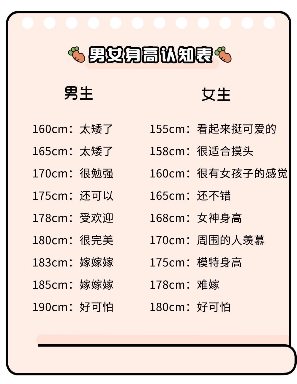 两天刷微博的时候看到一张【男女身高认知表】,(感兴趣的仙女也可以对照一下这个表格查一下自己的身高。)