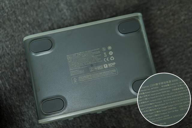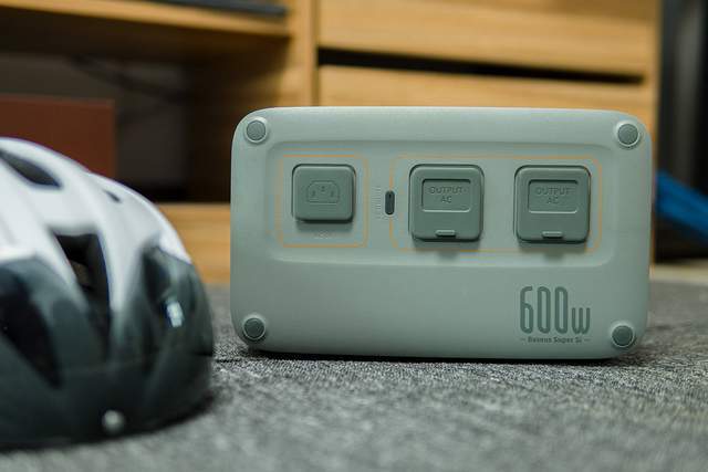 机身后侧标注了600W以及超级硅字符,超级硅是一种新型硅基材料,具有体积小、导热性强和效能转化率高等特性,在户外电源上使用还是非常罕见的,另外正反两面四角都有防撞硅胶垫,可以有效保护电源。