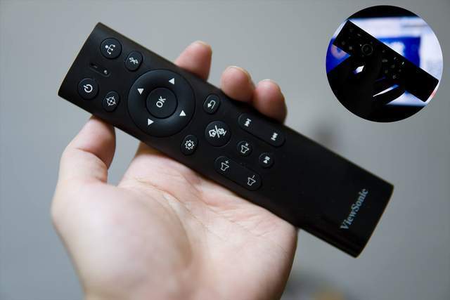 遥控器设计方面,优派Q20也比较特殊,大按键大间距摸起来比较舒服,拿起自动亮灯,可以让用户在黑暗环境下也能看得清,这点很用心。