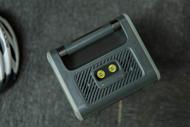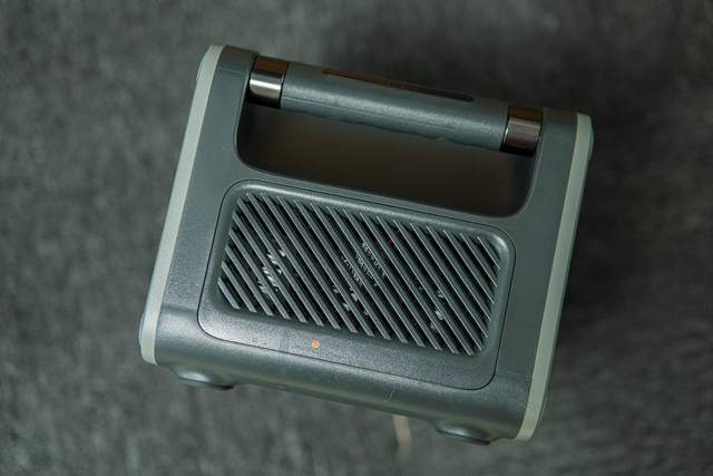 从侧边的栅格可以隐约看到散热风扇,这个风扇在大功率充放电时会开启;顶部两端带有提手设计,方便用户移动使用;照明灯支持常亮、SOS两种模式,应急照明使用非常方便。