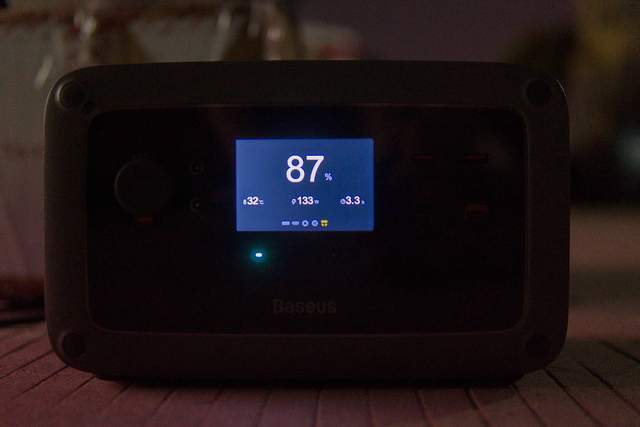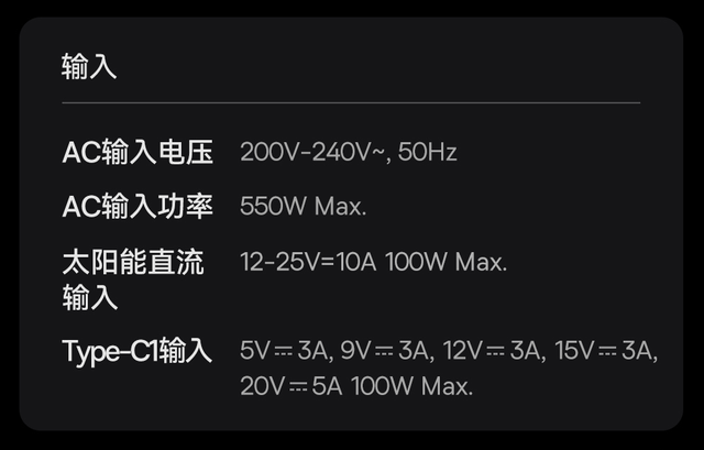 倍思户外电源支持多种输入模式,其中AC输入可以达到550W,实测半小时可以充满50%电量,1小时充满80%,1.5小时可以完全充满,速度非常快,当然此时风扇是开启的,有一定的声音。C口输入的话,最高100W,使用时注意下自己的充电头和充电线是否支持这个功率喽,追求轻便的用户可以考虑C口充电,追求速度的话,还是用AC充电吧。