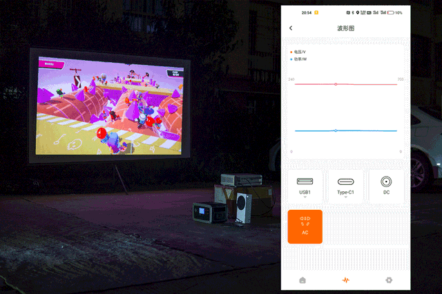 平时在使用倍思户外电影时,如果有电量焦虑的话,用户还可以通过手机APP随时查看其工作状态,如上图显示,当前电量剩余、工作瓦数、剩余使用时间、占用接口等都有标注。