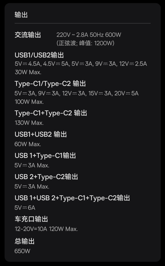 输出方面AC口最高支持600W,C口最高支持100W,AC口适用于电饭煲、电风扇等小家电,如果是手机、笔记本等,直接用C口充电会更方便。