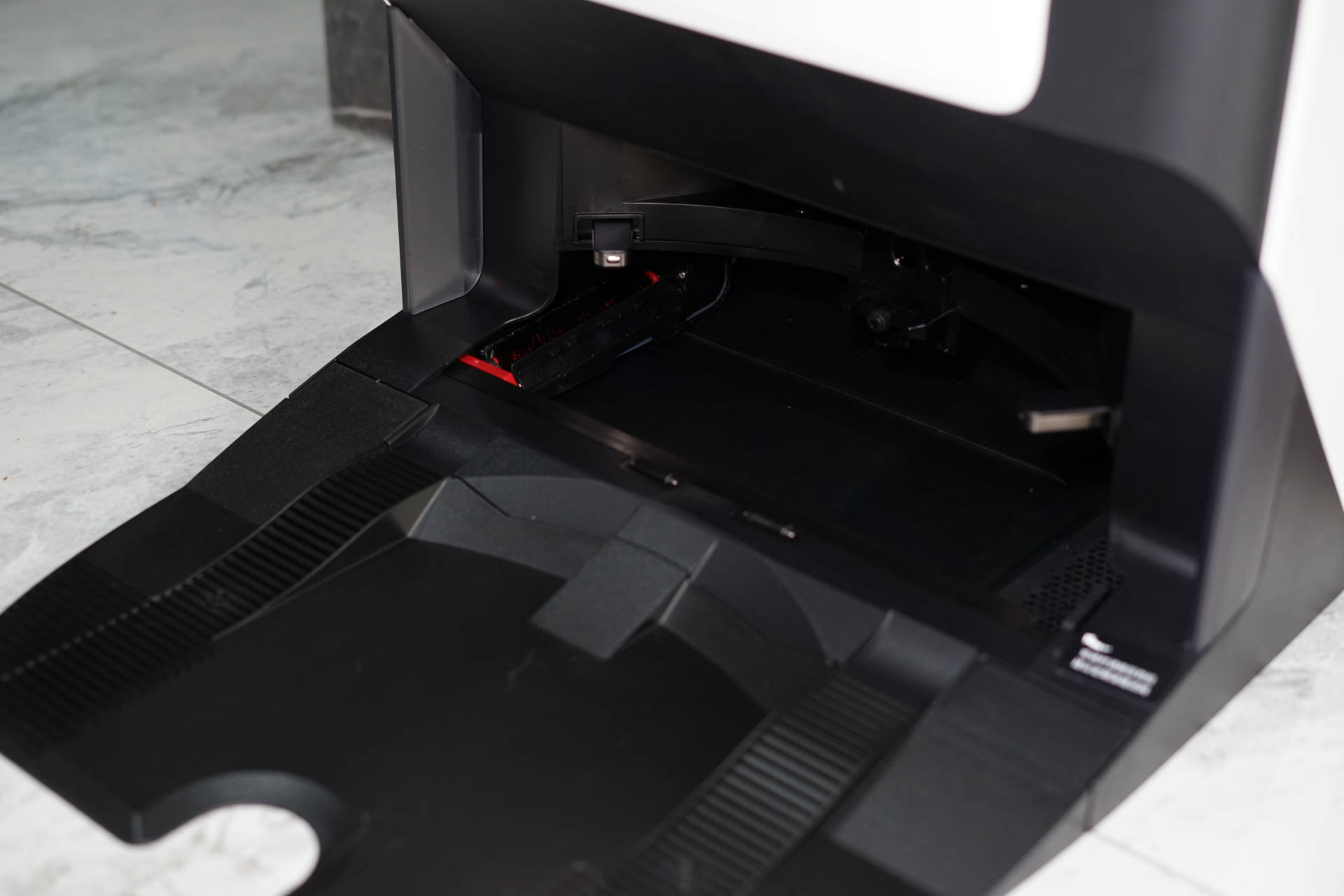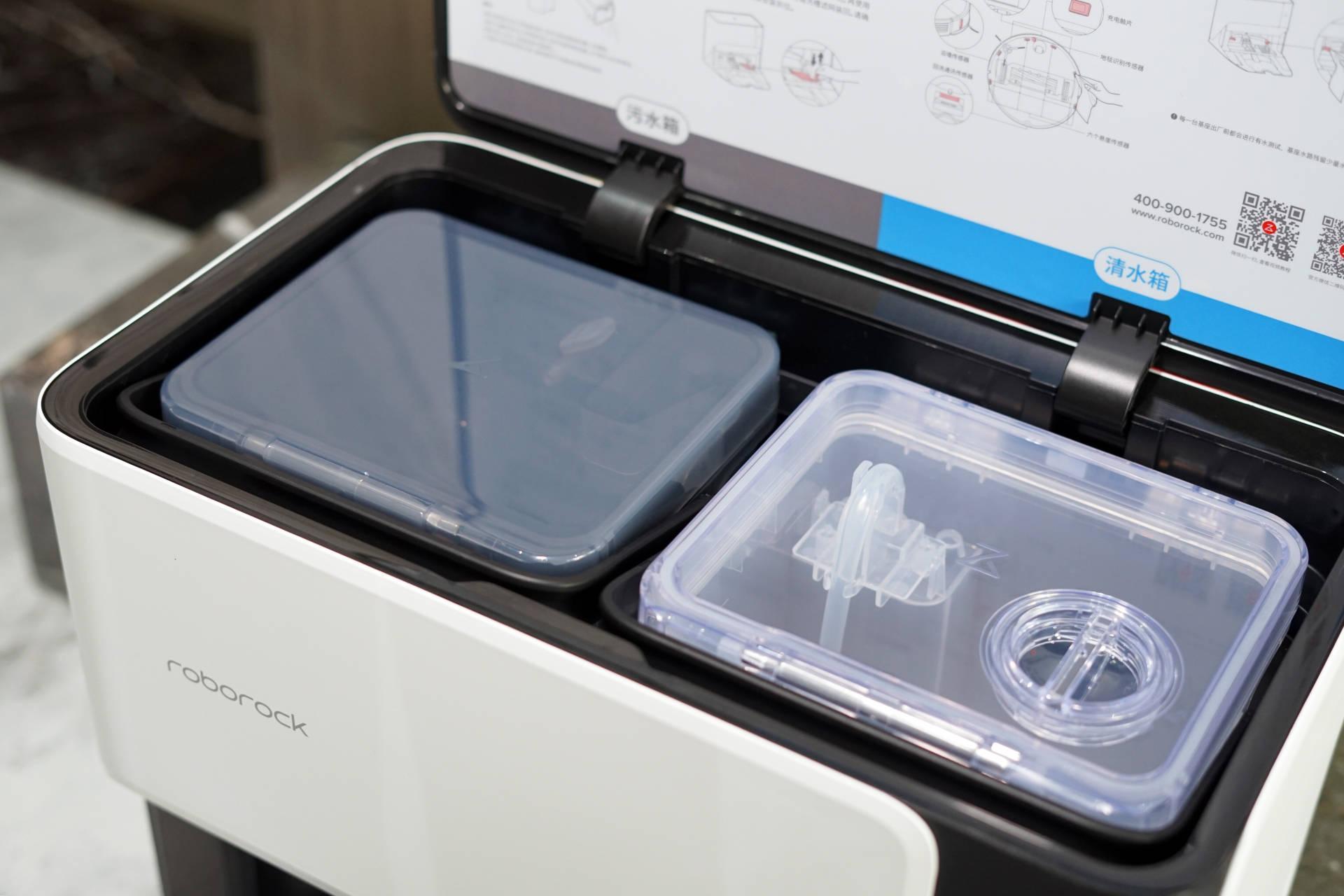 打开清洁基站后,可以看到一个2.9L的清水箱以及一个2.5L的污水箱,作用是为机器人水箱提供清水和搜集自清洁拖布后的污水。