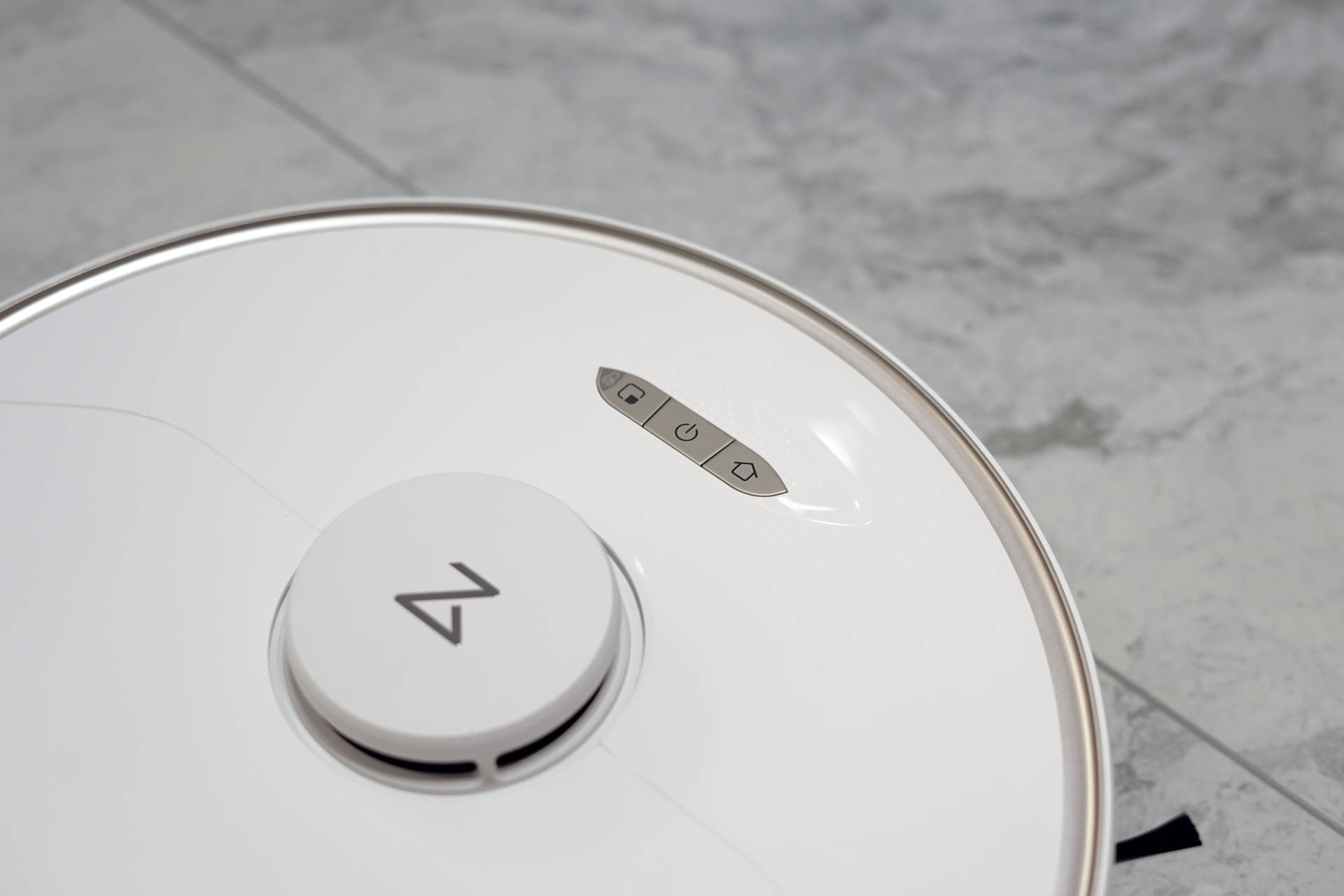机身顶部凸起部分的是激光传感器,而一侧的则是三个功能按键,从左到右分别是:开关机键、儿童锁/局部清扫键以及回充键。虽说,按键并不多,可实用性却很高,是使用频率最高的几个操作功能,至于其它功能操作则是需要通过APP完成。