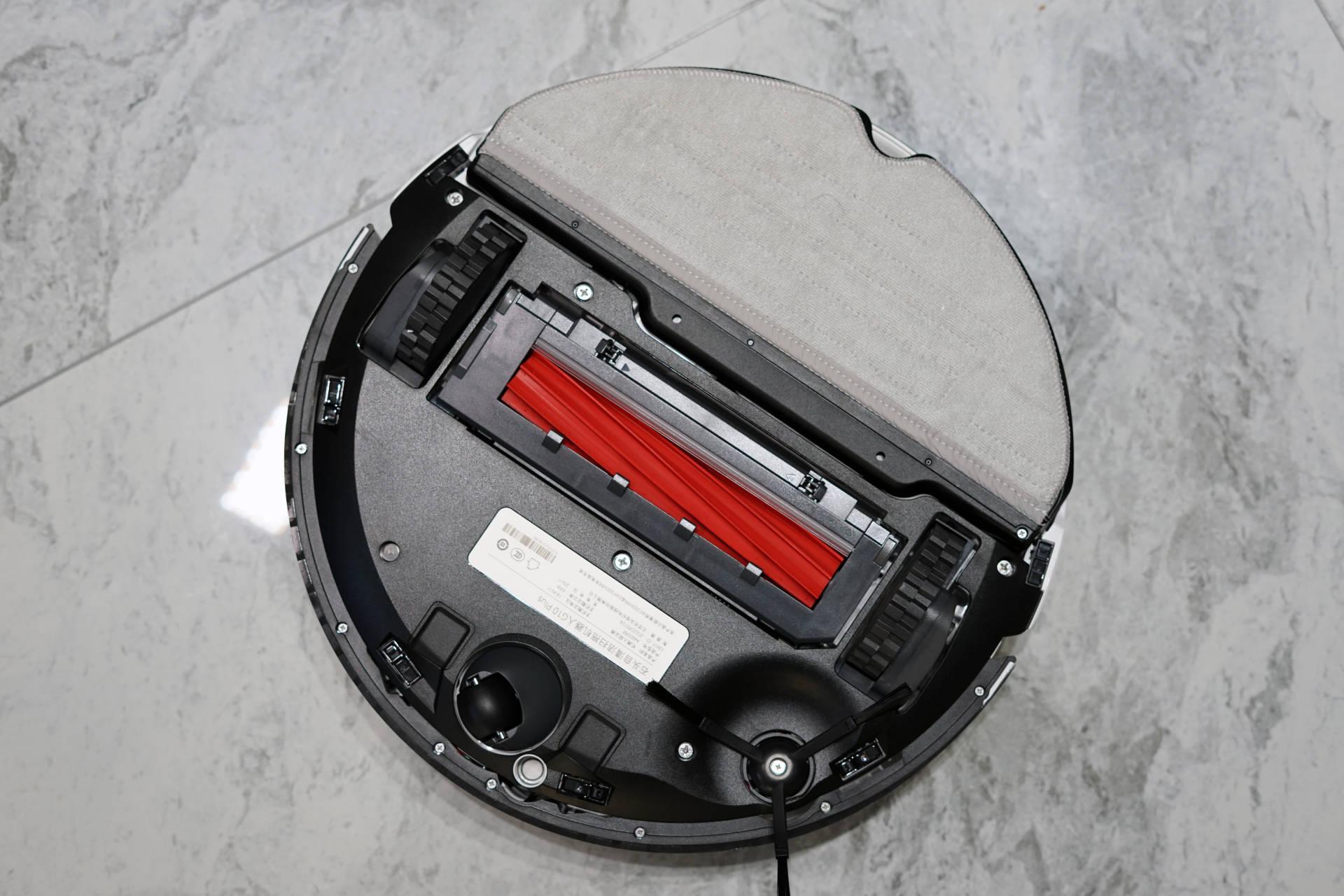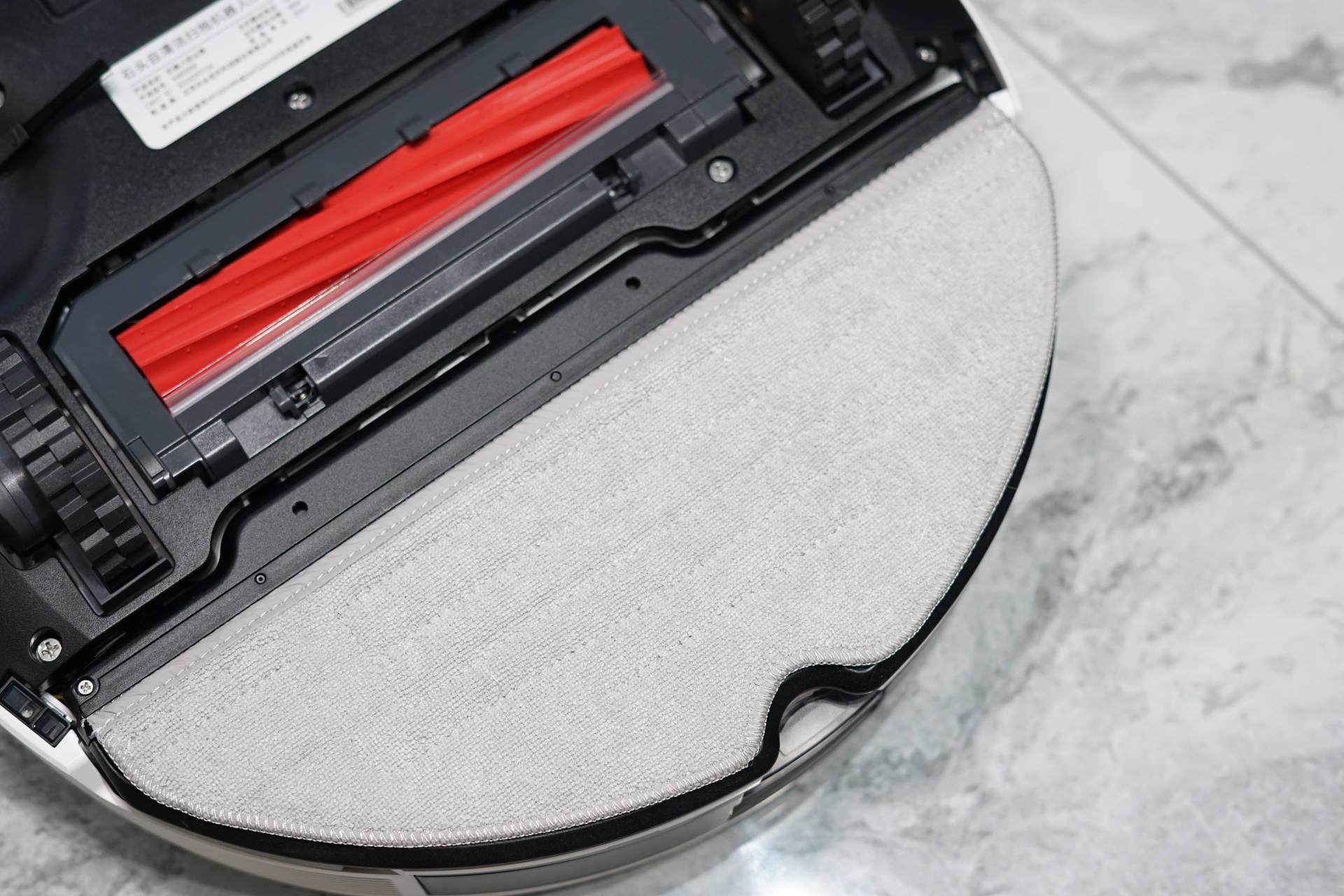 不过,因为石头G10 Plus是拖地机器人,所以比一般的扫地机器人多出了一个拖布组件,而且采用的是与上一代相同的抗菌材料打造,并占据了底部近一半的面积。