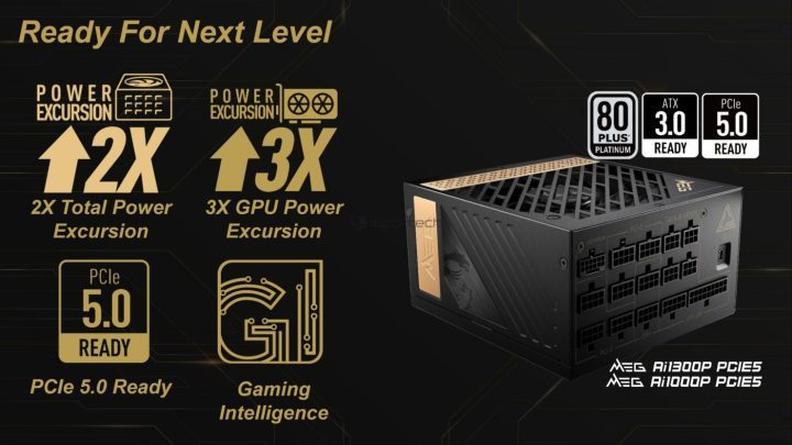 微星发布了全球首款ATX 3.0电源MEG Ai1300P PCIE5,符合PCIe 5.0标准,基于新的微星GI引擎,可以承受两倍的总功率负载峰值或三倍的GPU功率负载峰值,持续时间1到10毫秒。微星MEG Ai1300P PCIE5额定功率1300W,最高峰值功率可达2600W。获得80PLUS铂金认证,100%负载下转换效率超过89%。
