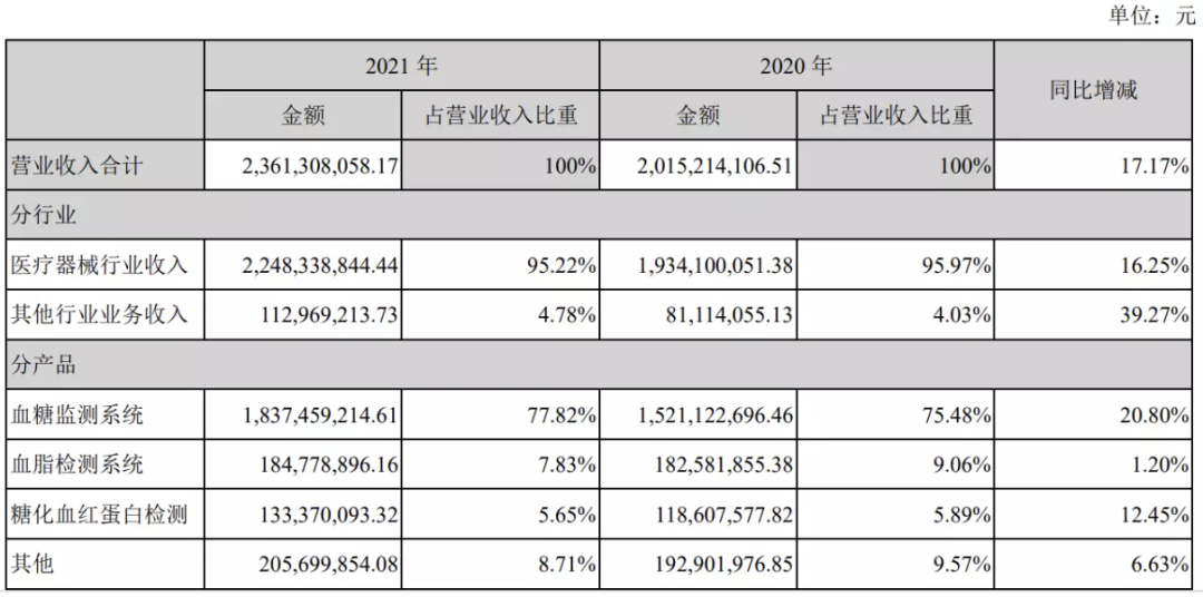 2021年,三诺生物营收23.6亿,其中血糖监测系统贡献了18.3亿,血脂检测系统贡献1.8亿,糖化血红蛋白检测贡献1.3亿。其中血糖监测系统营收占据了77.82%的比例,且较2020年增长了20.8%,也就是说血糖依然是三诺生物的拳头产品,且越来越倚重。POCT是IVD行业中增速最快的子领域之一,三诺生物希望POCT可以打造新的增长点,但目前依然未能如愿。