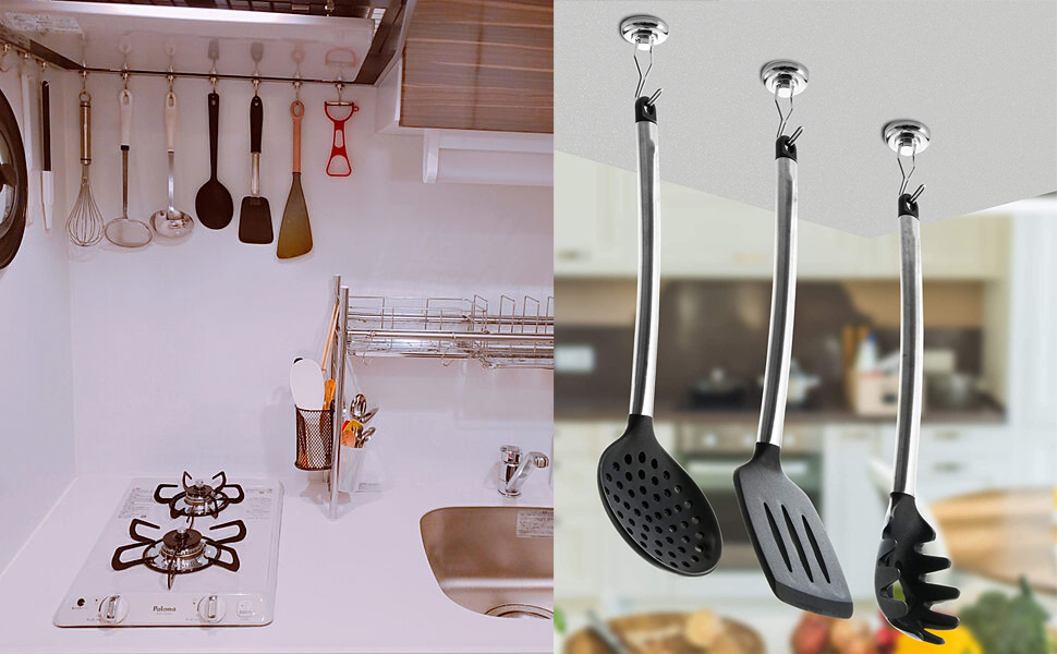 当然如果不是很喜欢增添大物件的话,改造一下厨房上部空间也不失为一种好方法,比如安装这种可以放置小件物品的架子,就将它安装在灶台的左右两侧,也能起到很好的收纳效果。
