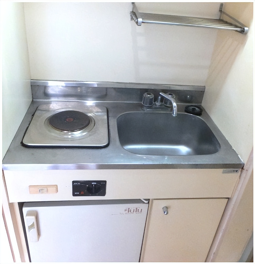 在国内我们已经很习惯那种双煤气灶的灶台,相邻的正好是一个90°转角台面,连接的是一个用于切菜的空间,旁边就是水槽。但是日本的单身公寓往往就只有一个煤气灶,甚至水槽的大小都只有国内的1/2,连砧板都没地方放。
