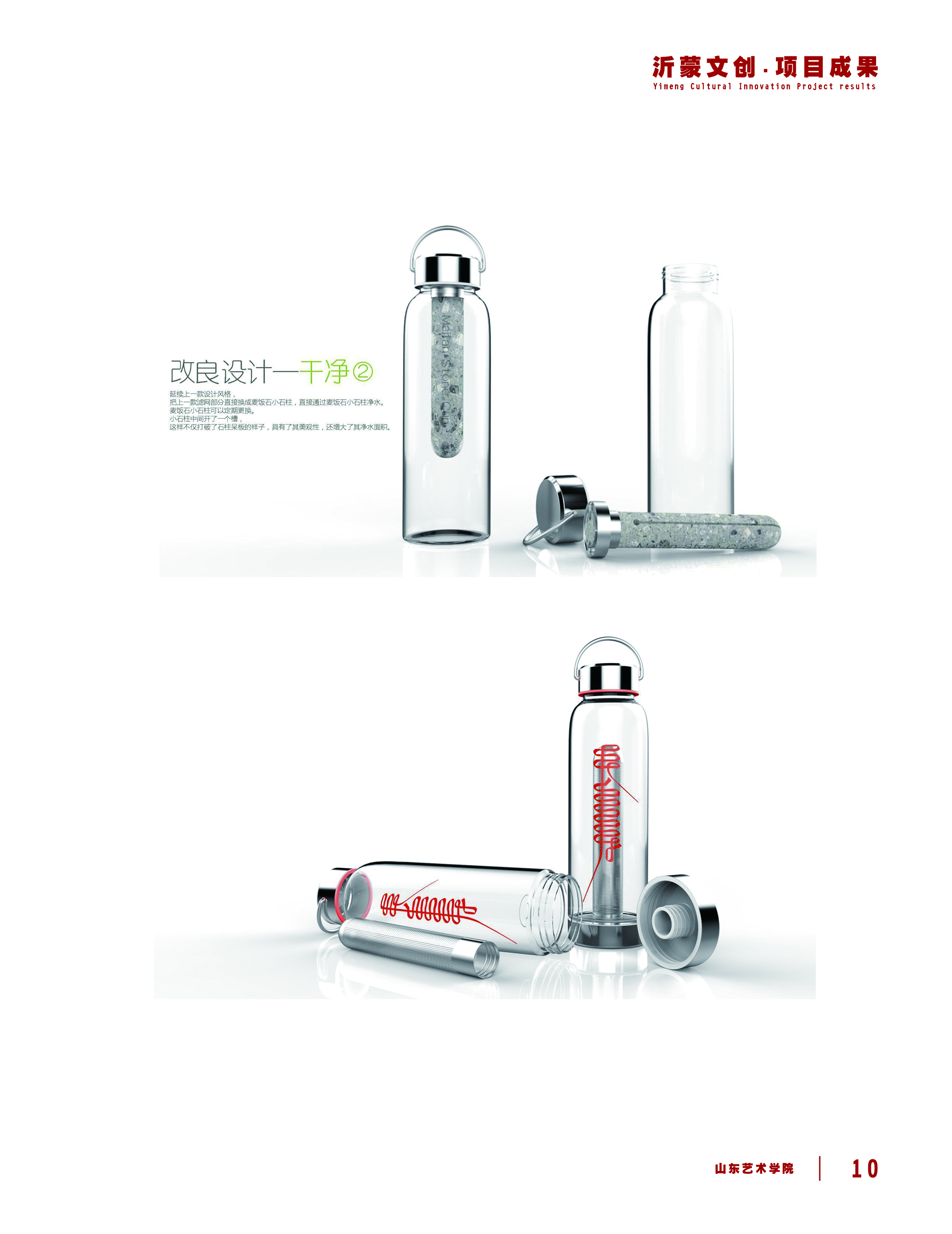 沂蒙山地区盛产麦饭石,具有吸附作用,可以提高免疫力,能改善水质,同时具有药用价值。现在市场上已经有用麦饭石制作的水杯,但是产品本身存在较多缺陷,主要表现在生产处理上表面工艺较差,制作工艺较为粗糙,麦饭石质地较脆,难以精细加工;外观上麦饭石本身颜色纹理缺少美观性,用麦饭石直接做出的产品不具备观赏性;项目组根据前期的实地调研及产品痛点分析,以及对市场同类产品调研的情况进行了综合分析,对麦饭石水杯进行了全新的设计,水杯根据使用功能的要求,在内部麦饭石的嵌入上使用了两种结构,分别是柱形不锈钢漏网和麦饭石石柱。在柱形不锈钢漏网中加入麦饭石颗粒,将麦饭石颗粒最大面积的与水相接触,以便于最快速度的转化水质,发挥麦饭石独有的特效转换;也可以将柱形漏网换为麦饭石石柱,更加方便人们使用和更换。在杯体外观图案的选择上分为:寿字形图案,根据寿字的字样进行创意转化设计,寓意麦饭石健康长寿的功效;麒麟送子图案,麦饭石的碱性转化功能可以使身体形成碱性体质,为提高生子功能增加了可能性。在设计方面充分考量了功能与文化的交融,使得麦饭石水杯在实用性方面有了很大的提升,外观以全新的样式进入人们的视野。
