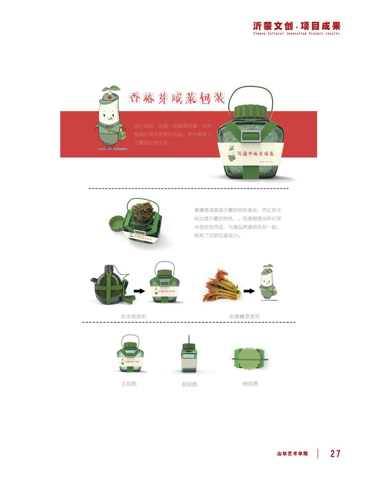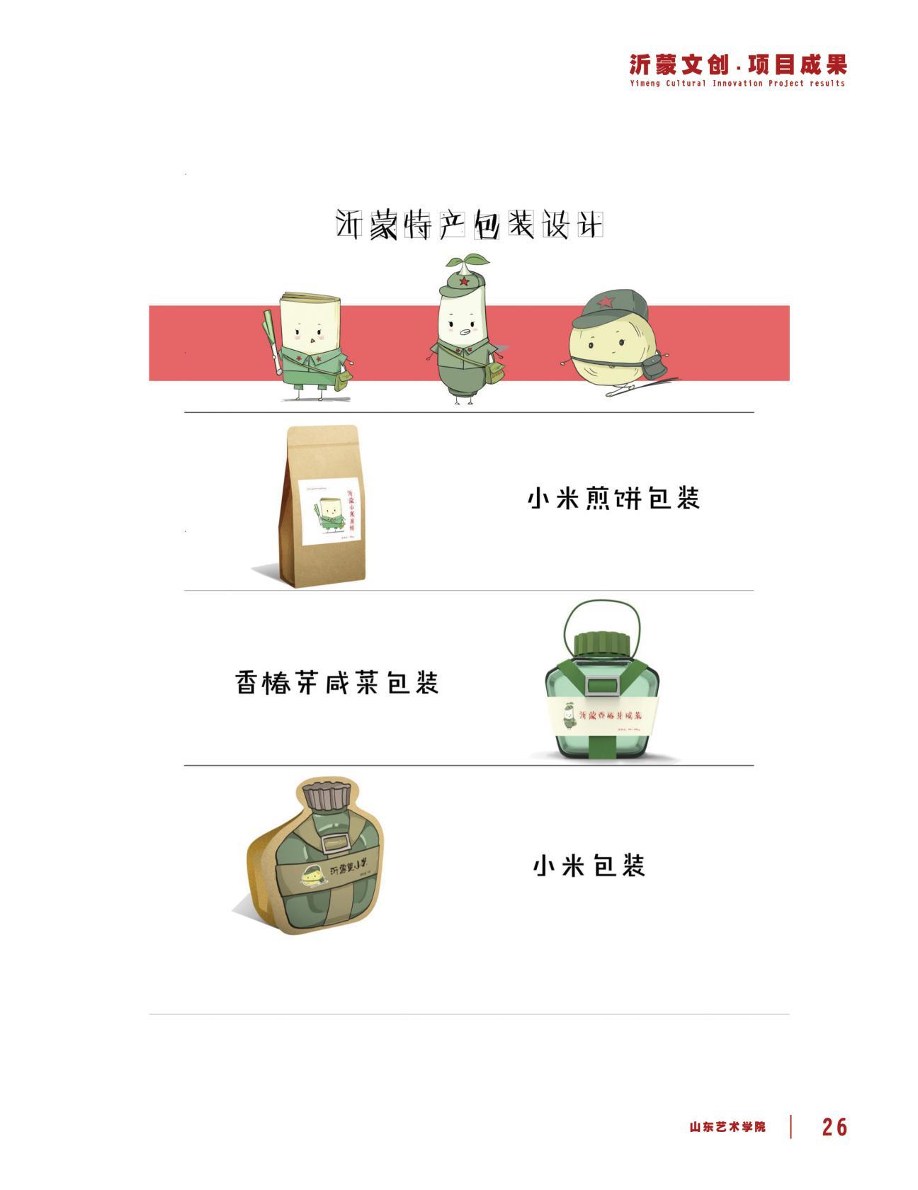 说到沂蒙精神,人们情不自禁地就想到了沂蒙人民将粮食送去前线支援红军的景象,这就是沂蒙人的无私奉献的精神体现。此组设计就是基于这种革命情怀上对沂蒙特产进行物化的包装设计,设计的选题选择了最具沂蒙精神物化特点的煎饼、大葱、小米等特色物产,将它们进行拟人化的设计,与解放军的人物形象进行很好的结合,同时在容器的设计上也与解放军的生活用品进行了融合,以亲切的外形及卡通形象受到消费者的青睐,并充分体现出了用现代生活化的设计语言诠释新时代背景下的沂蒙精神,以潜移默化的形式影响着消费者。