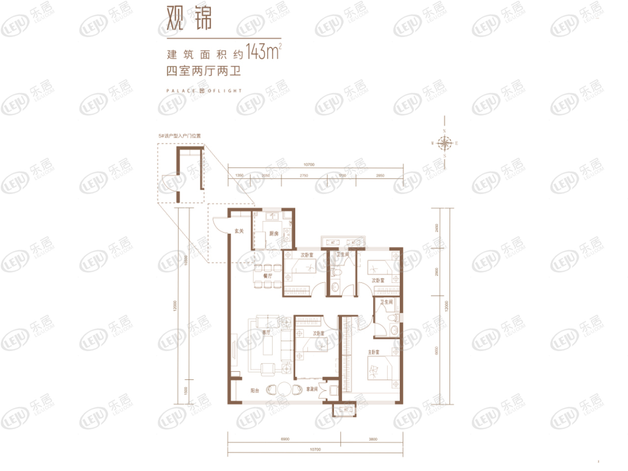 该户型为建面约143㎡的四室两厅两卫的格局,完全满足现在三代同堂的居住需求,户型整体格局分布合理,属于舒适型四居。在空间使用层面,该四居室的户型设计为全明客厅,餐客一体,客厅与餐厅带有连接观景阳台,开间达到6m,远高于其他户型,开窗即能看到窗外美景。客厅餐厅为一体设计,可容纳多人同时进餐。