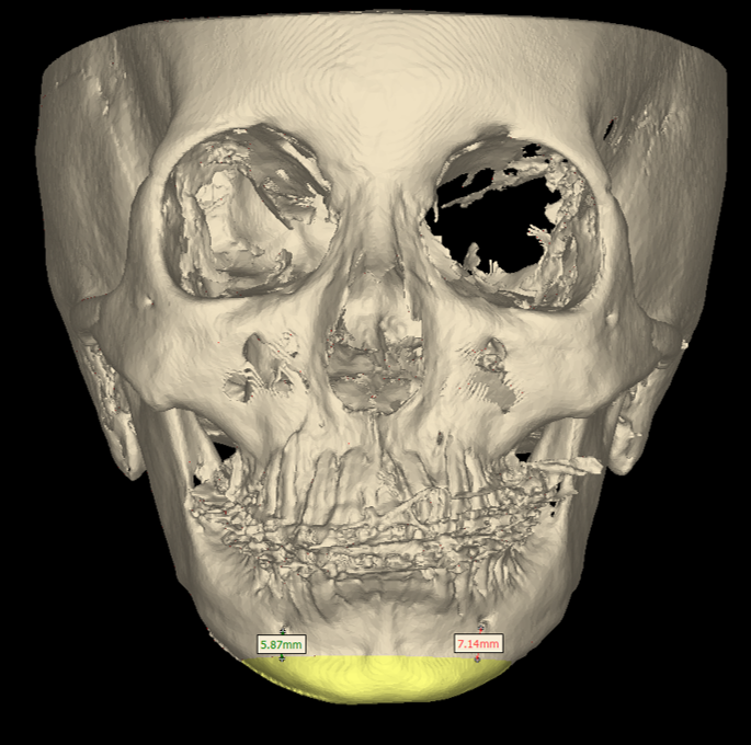 口腔颌面外科副主任王耀钟接诊后仔细为其检查,诊断为“双颌前突颏后缩”,单纯牙齿矫正治疗无法解决问题,符合正颌手术指征,可以进行正颌治疗。从术后效果来说,实施上下颌手术最为理想,但患者在外院接受过正畸治疗,考虑到咬合关系,已无双颌手术操作空间,应患者强烈要求只能进行单纯颏成型手术。