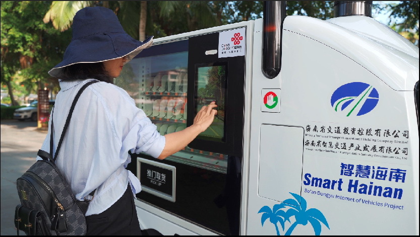 在海南省琼海市博鳌镇东屿岛,一条长达17公里的运营线路,拥有无人小巴、无人出租车各4辆,智慧站牌3个,无人清扫车、无人售货车各两辆。记者在现场看到,乘客可通过APP自助约车,自动驾驶小巴不仅能够自动识别红绿灯、变更车道、在路口转弯等,还会及时避让其他车辆、自行车、行人。无人清扫车则沿着规划好的路线自动进行清扫和消毒作业。无人售货车在道路沿途为游客提供扫码即停、招手即停服务。