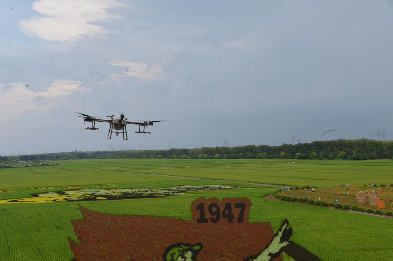 “嗡……”带着风声,一架大型无人机在黑龙江北大荒闫家岗农场的千里水稻田上腾空而起,开始植保作业。水稻随风轻摆,显出勃勃生机,走近细看,略显青涩的谷粒已开始孕育灌浆,应和着水田里的巨幅稻田画,预示着即将到来的喜庆丰收。