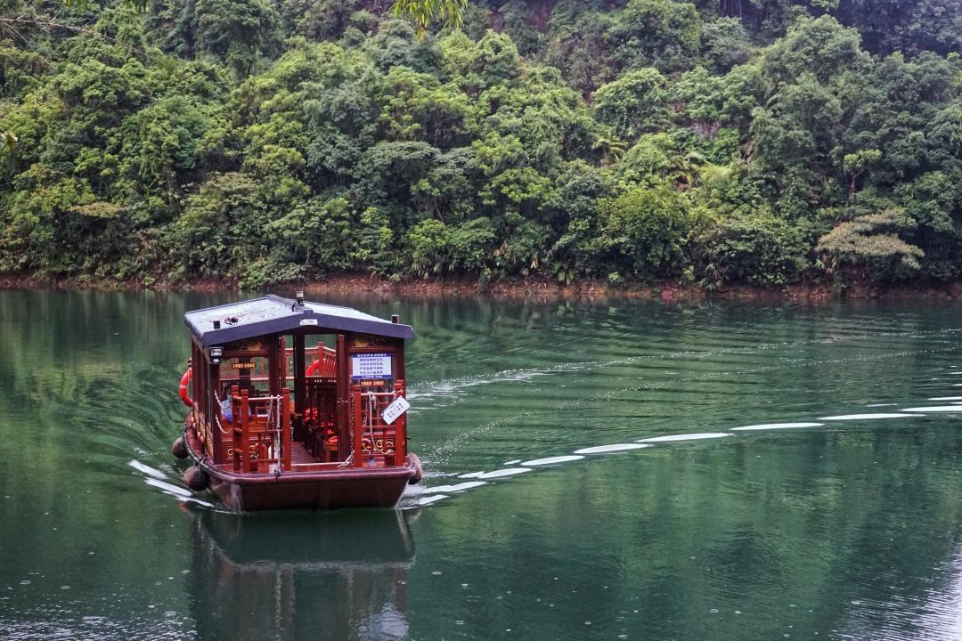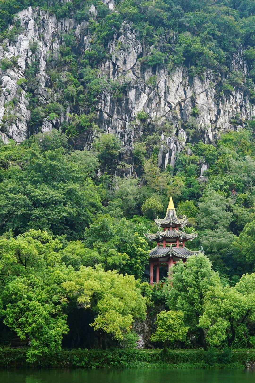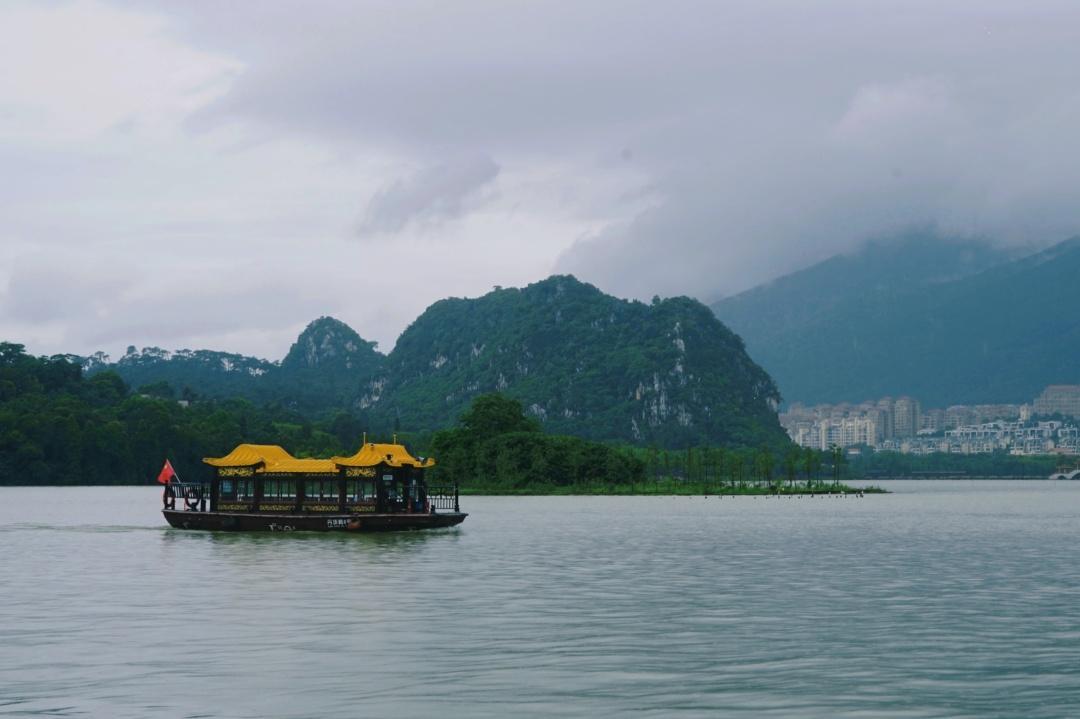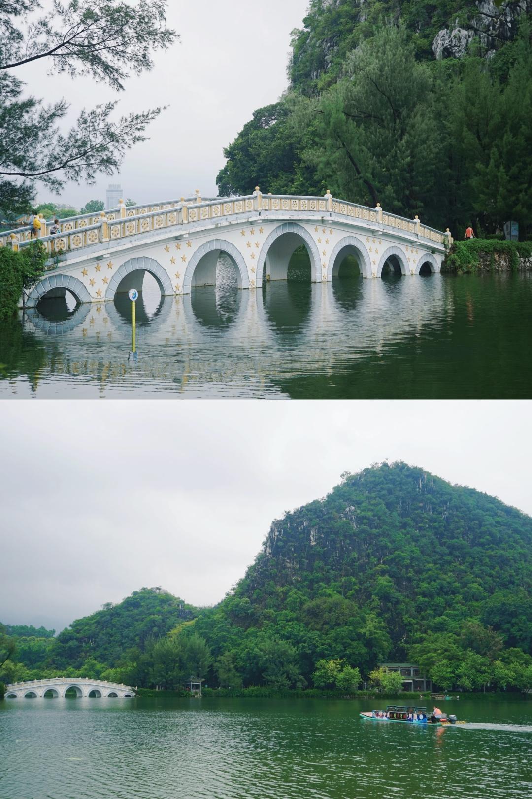 七星岩,得名于七座石灰岩峰,排列的形状像天上的北斗七星,有着“岭南第一奇观”的美誉。环湖一周大概10公里,可以步行、坐电瓶车或者坐游船。