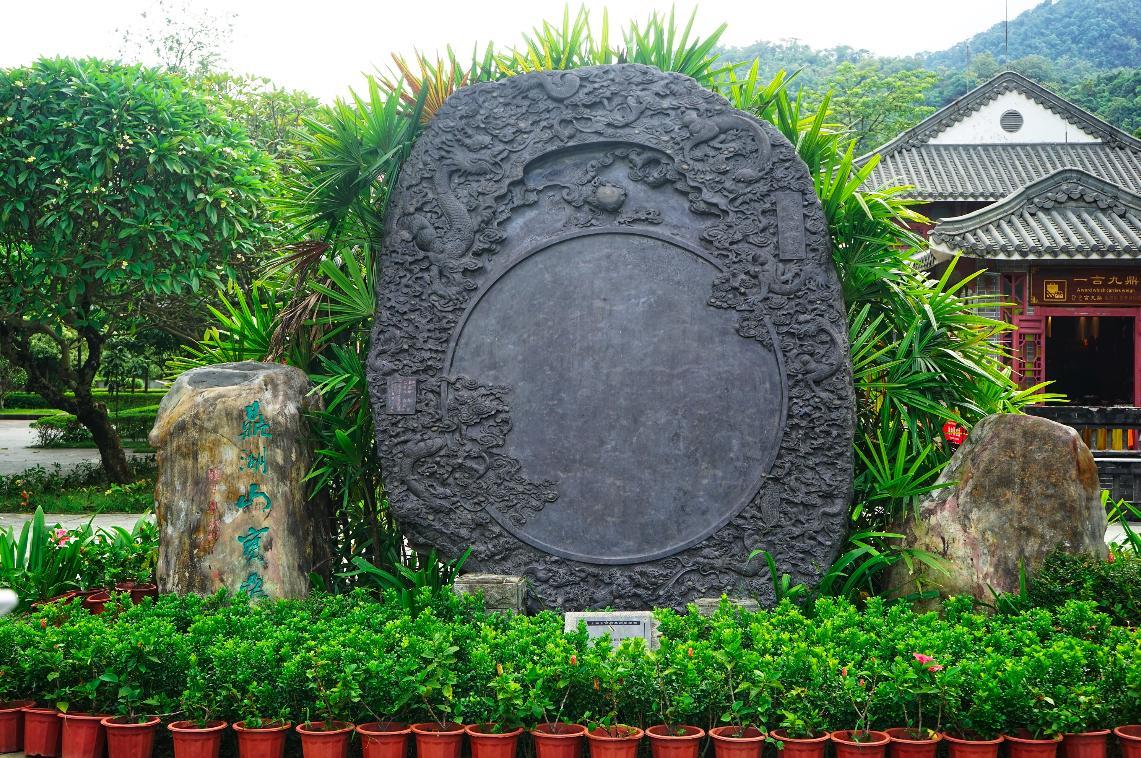 在九龙宝鼎前面的端溪龙皇砚,也是一个世界之最哦!整个端砚重达两吨,用一整块砚石雕刻而成。砚石上一共有108条栩栩如生的云龙和水龙,138个大小不一的石眼。