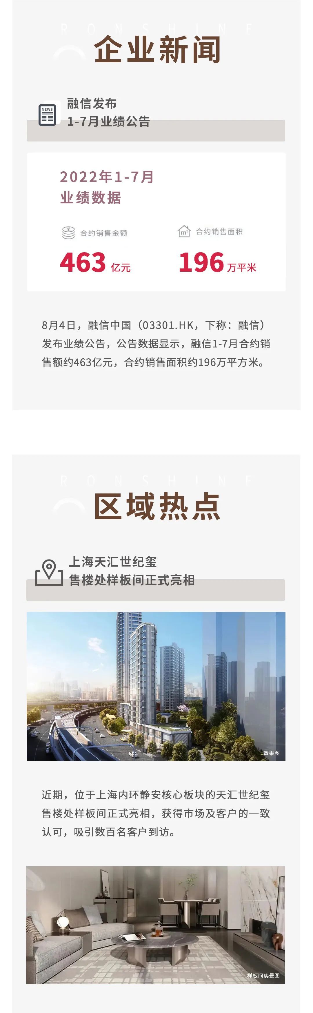 8月4日,融信中国(03301.HK,下称:融信)发布业绩公告,公告数据显示,融信1-7月合约销售额约463亿元,合约销售面积约196万平方米。