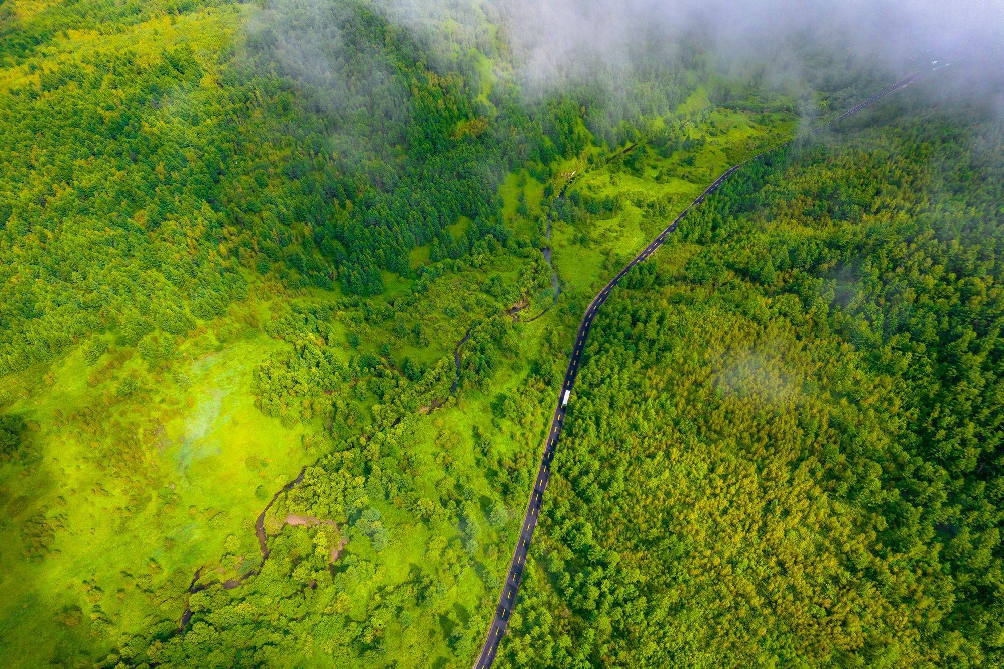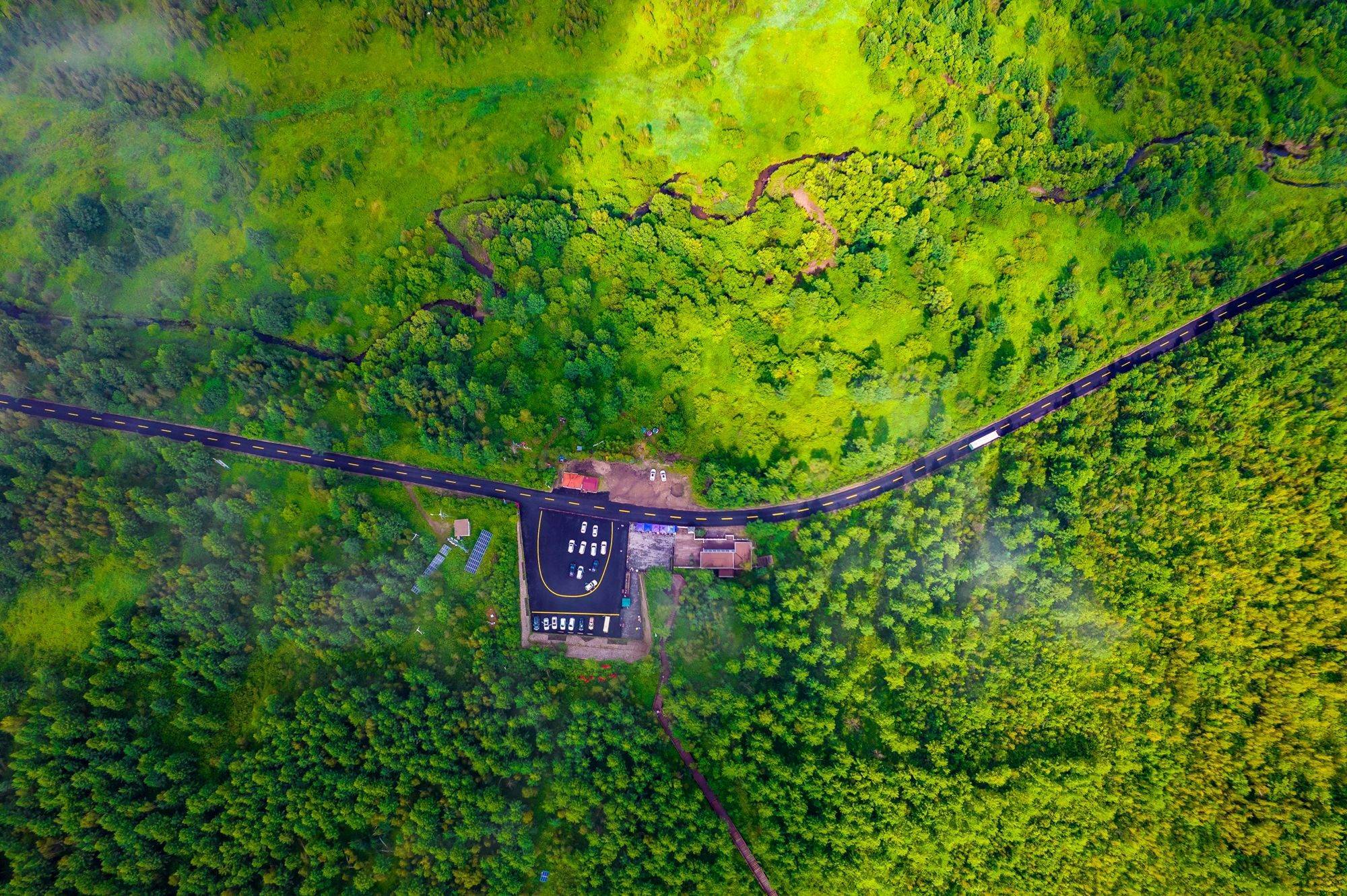 从航拍角度看,才会明白古诗中“不识庐山真面目,只缘身在此山中”的妙义。近处映入眼中的是近在咫尺、放大的美,而远观,收入眼中的则是苍茫壮美而又有着伊甸园意味的神秘之美。