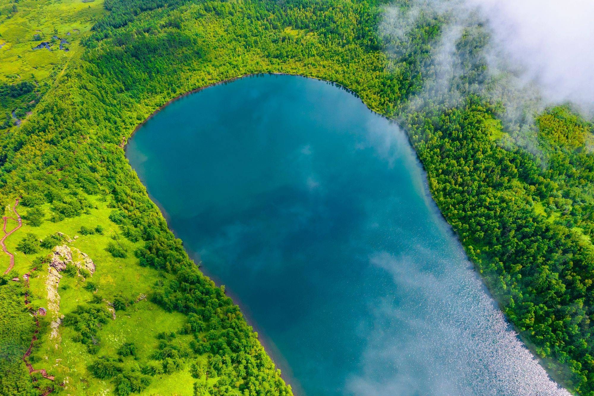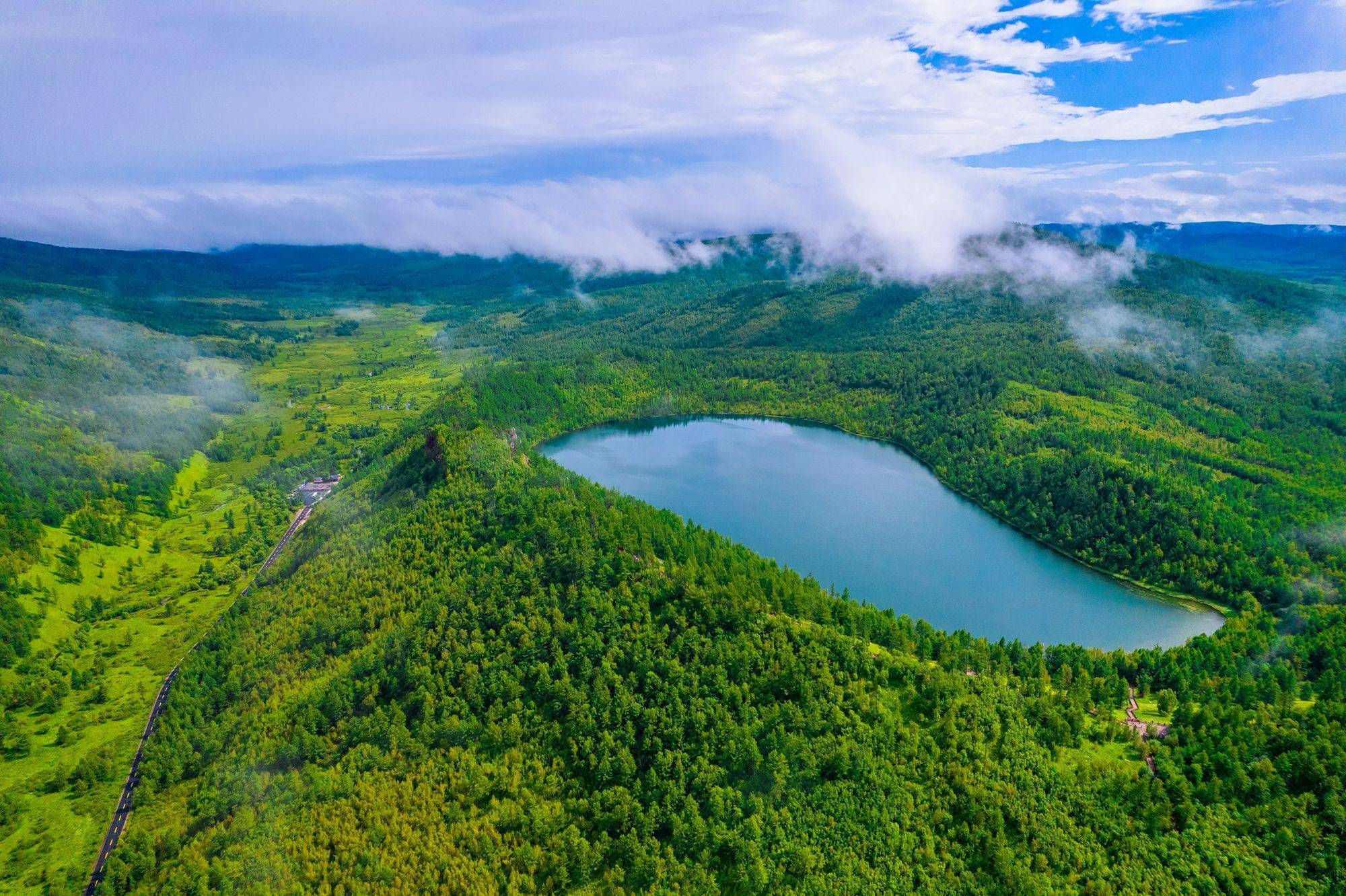山巅之上,镶嵌在丛林中的阿尔山天池仿佛一面明镜,散发着神秘迷人的光泽,犹如天外飞来。