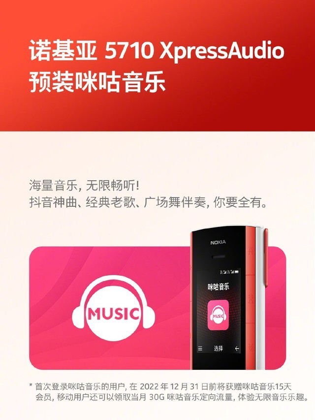 据消息显示,诺基亚手机宣布诺基亚 5710 XpressAudio将在8月17日上午开启预售,并宣布预装搭载咪咕音乐 App。首次登录咪咕音乐的用户,在2022年12月31日前将获赠咪咕音乐15天会员,移动用户还可以领取当月 30G咪咕音乐定向流量,体验无限音乐乐趣。 这款手机还预装喜马拉雅应用,在线电台、新闻小说、想听就听,同时支持内容个性化定制。