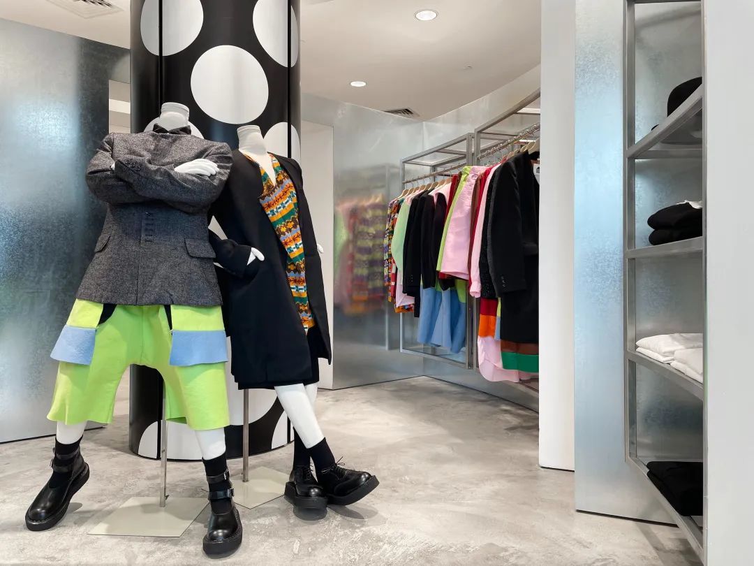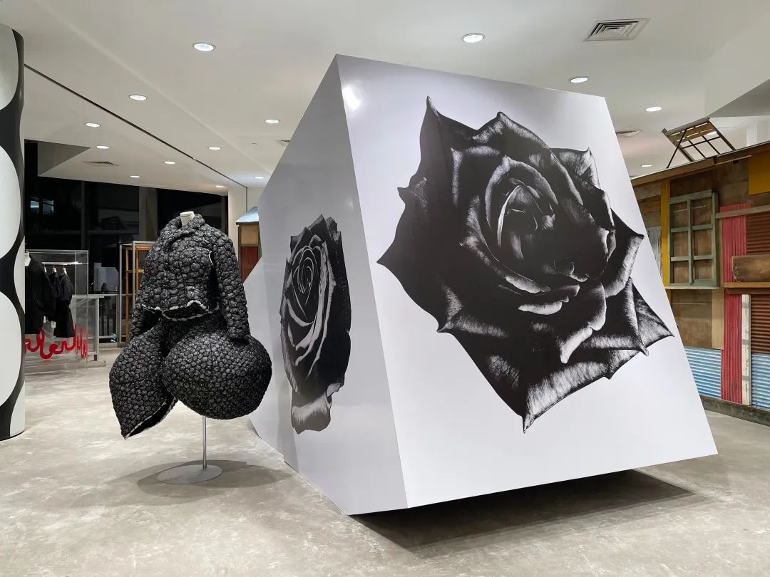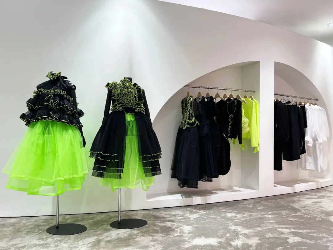 位于二层的 noir kei ninomiya 自品牌创立以来,设计从不受市场与潮流的驱使,而是通过不断探索以寻求全新的创作,同时将全新技术与传统工艺相融合,完美平衡廓形与面料使其相辅相成。2022 秋冬系列中,创始人兼设计师 Kei 仍然选择基于他最钟爱的黑色,并将其与一些极为明亮的霓虹色调混合,通过纹理感赋予这些黑色面料不同的层次解读。