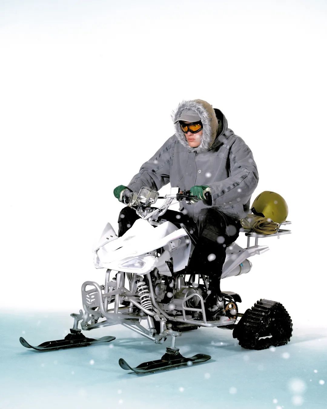 C2H4 对当代面料材料和工艺的探索依旧延展在此系列之上,压褶,分割及成衣染工艺保留的同时,C2H4 在传统滑雪服饰的基础上运用面料的拼接来突破固有功能性服装的运动感,运用针织,西装面料与传统功能性面料相结合将户外服饰正装休闲化。复古的图案设计及颜色的氛围。是 Case#R006 的全新尝试,在突出面料带给服装不同质感的同时也增加了复古语言的描述。在品牌标志性颜色保留的基础上点缀了褪色橘红,绿色,丰富了冬季雪场氛围。Case#R006 系列俱乐部徽章延续成员身份标识,以多种工艺形式出现在产品上,以强化俱乐部成员着装规则。