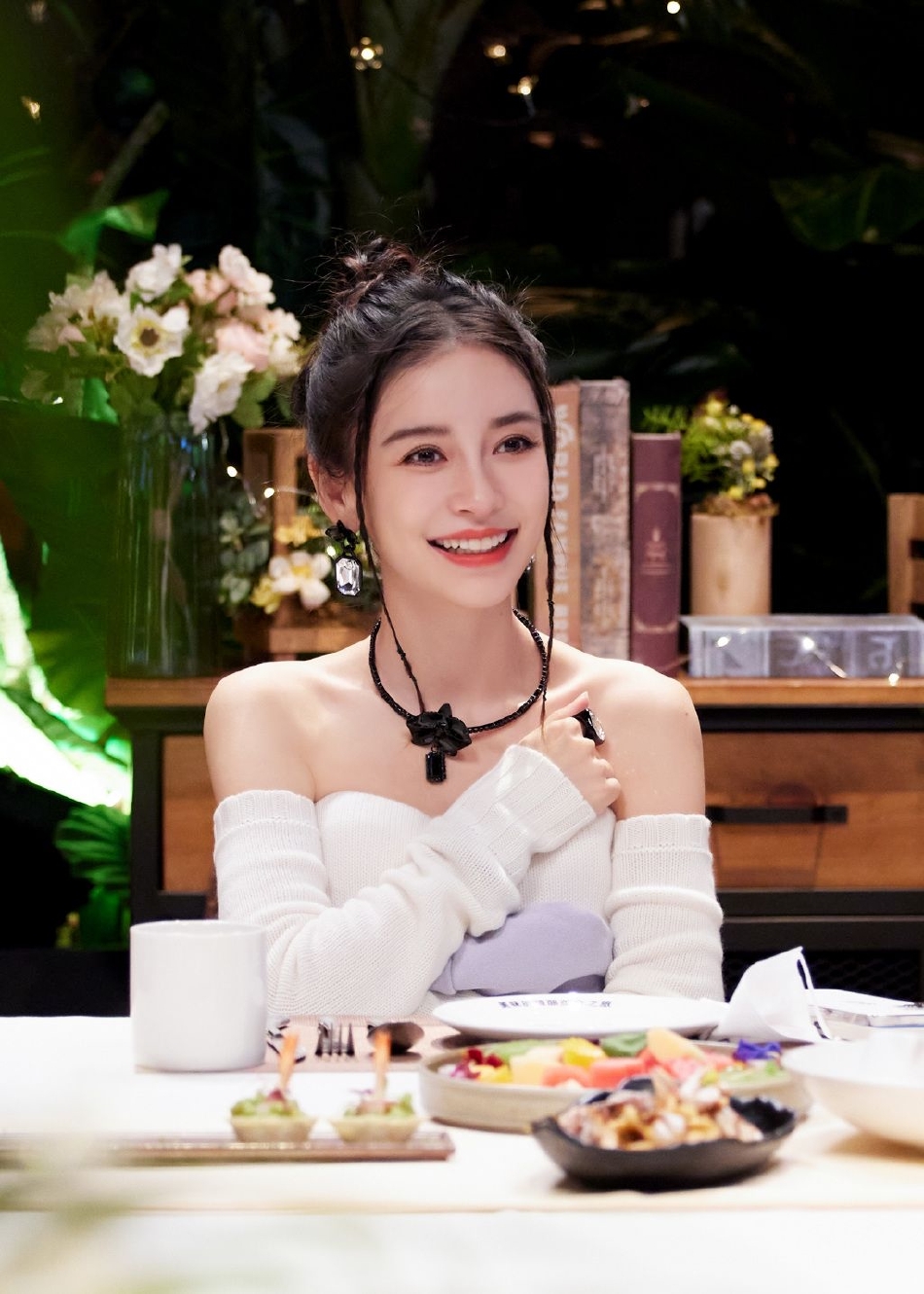 Angelababy录节目抹胸露香肩 大秀天鹅颈又纯又欲