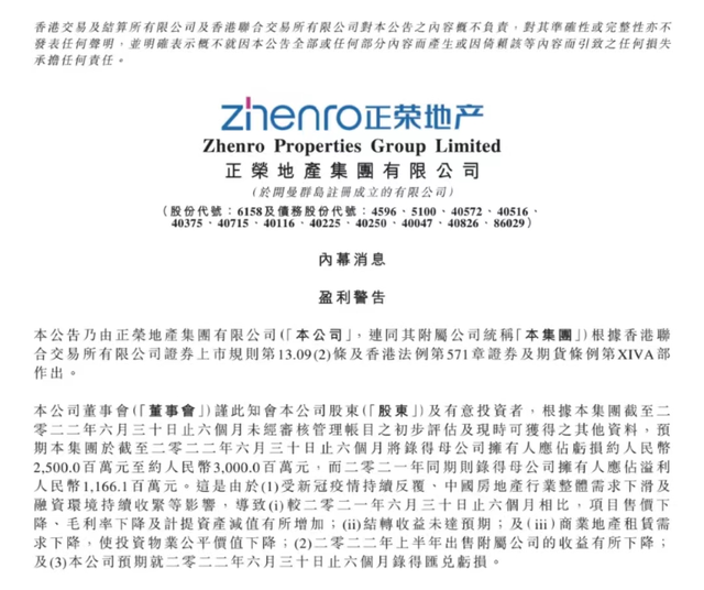 据正荣地产预估,2022年上半年公司归母净利润亏损约25-30亿元,同比最多下降357.3%。