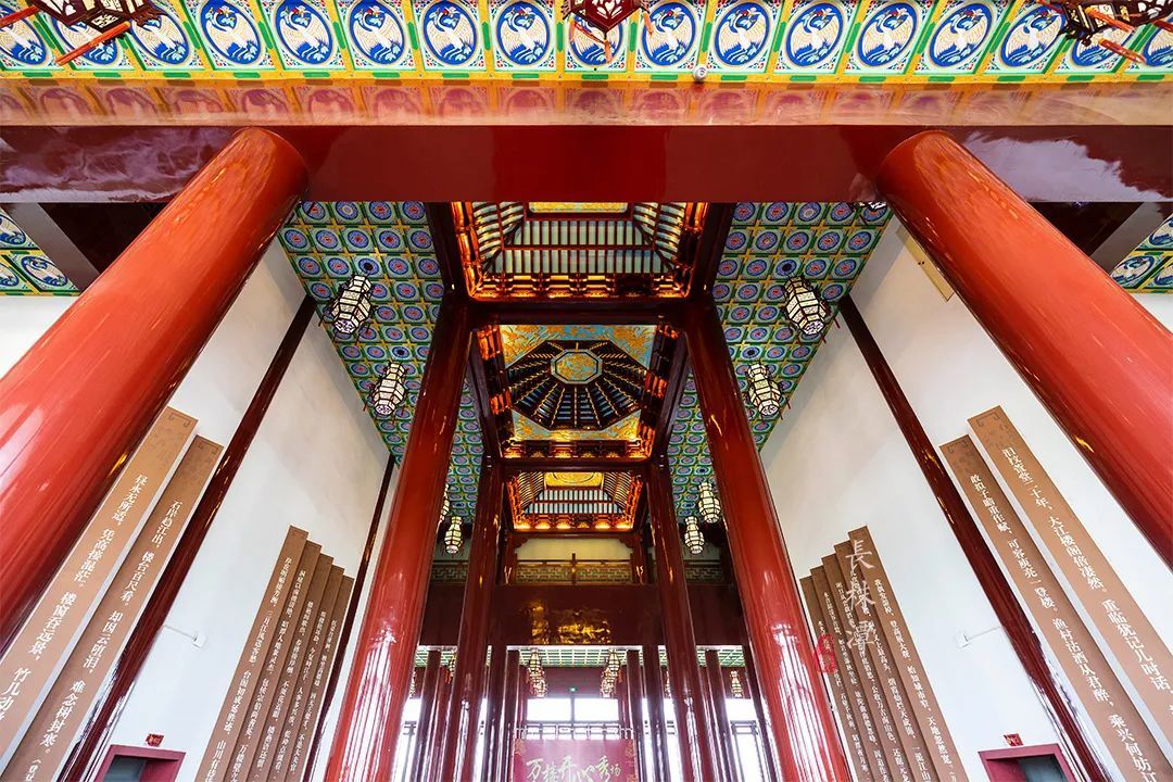 走入楼内,抬首仰望,几根廊柱是饱满红色,屋顶则装饰了精美花纹。