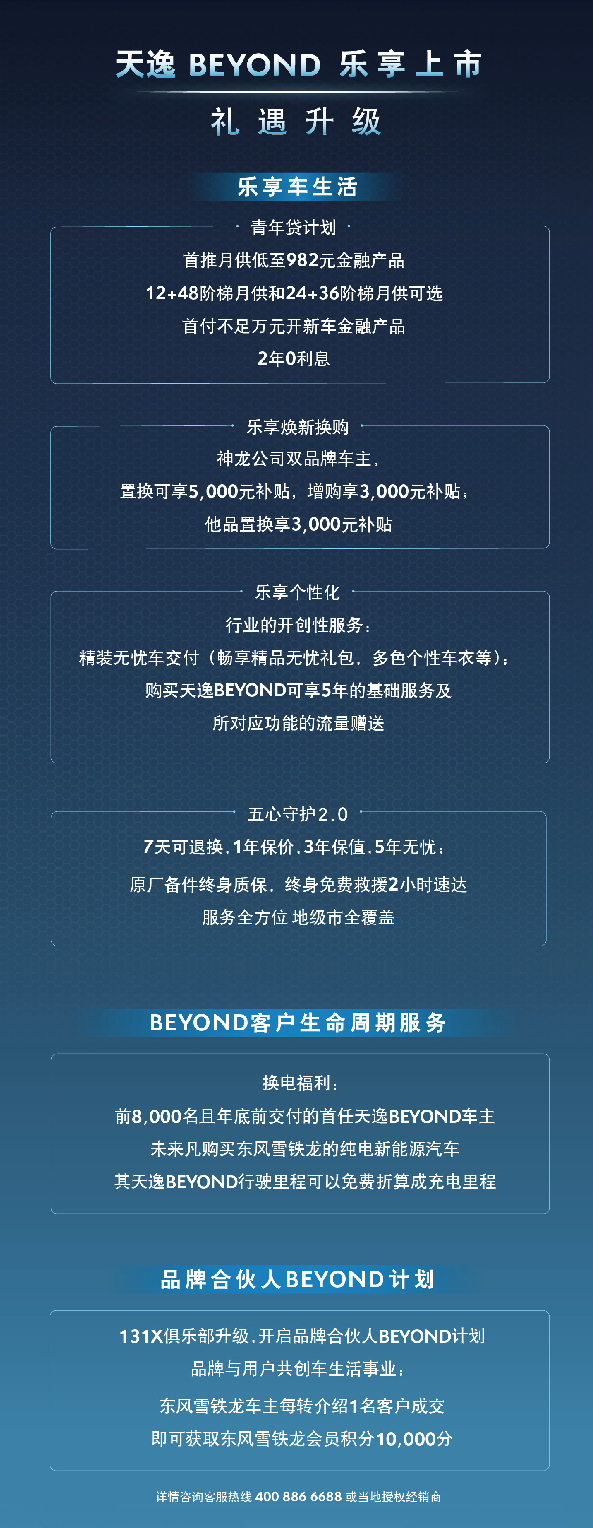 即日起客户可通过东风雪铁龙超级APP和 “东风雪铁龙 因你不同”小程序一键下定,享天逸BEYOND“青年贷计划、乐享焕新换购、乐享个性化、五心守护2.0”的上市礼遇,从购车到用车,让无忧出行体验触手可及。