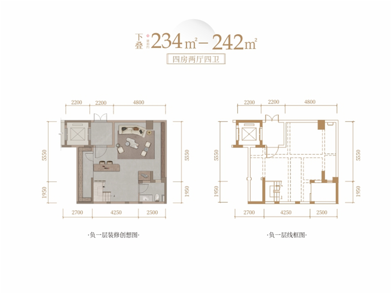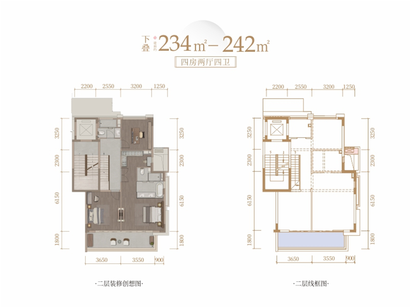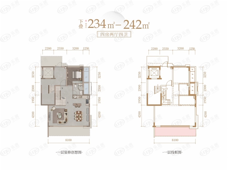 南向全景玻璃幕墙连接庭院,下叠一层达到了8.1m的开间,通过室内“少梁化”使得全屋通透性增加,大面宽阳台,270度落地大玻璃窗观景,格局十分大气。整个空间设计相比市场同面积下叠户型有很大优势,白天即使不开灯,自然光线也会充盈整个空间。