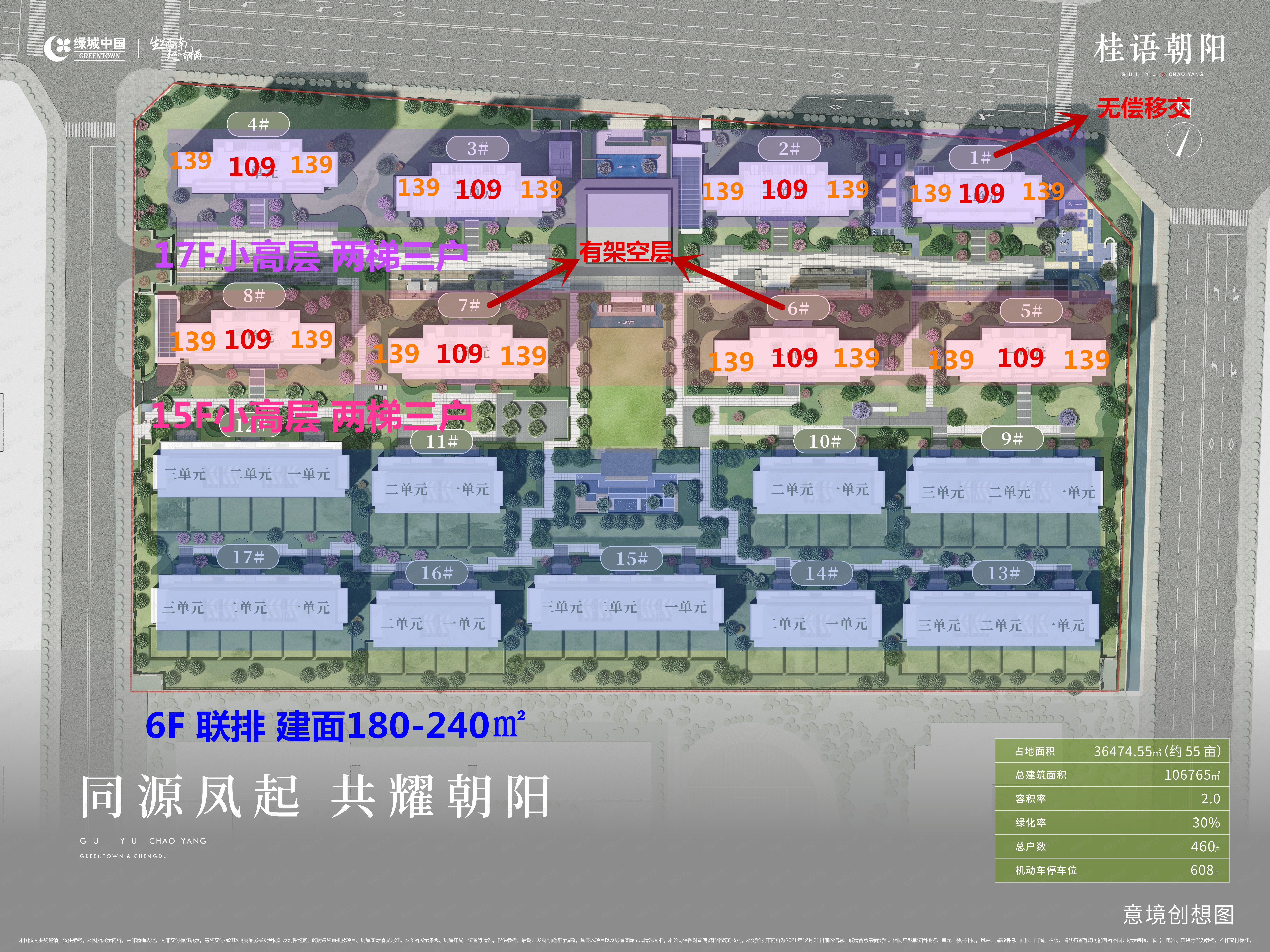 1-8号楼主要打造小高层产品,1#楼无偿移交给政府,6#、7#楼一楼有架空层,其余楼栋无架空层、无底商,居住较为纯粹。9-17号楼为层高6F的联排,建面178-242㎡。
