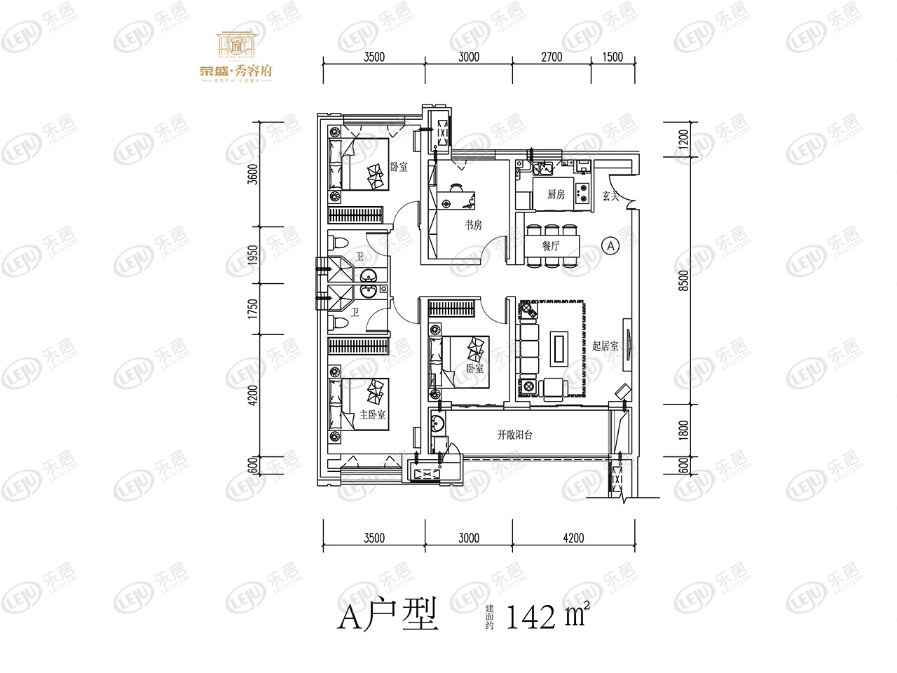 该户型为建面约142㎡的四室两厅两卫的格局,完全满足现在三代同堂的居住需求,户型整体格局分布合理,属于舒适型四居。在空间使用层面,该四居室的户型设计为全明客厅,餐客一体,客厅与次卧带有连接观景阳台,开间达到6.2m,远高于其他户型,开窗即能看到窗外美景。客厅餐厅为一体设计,可容纳多人同时进餐。