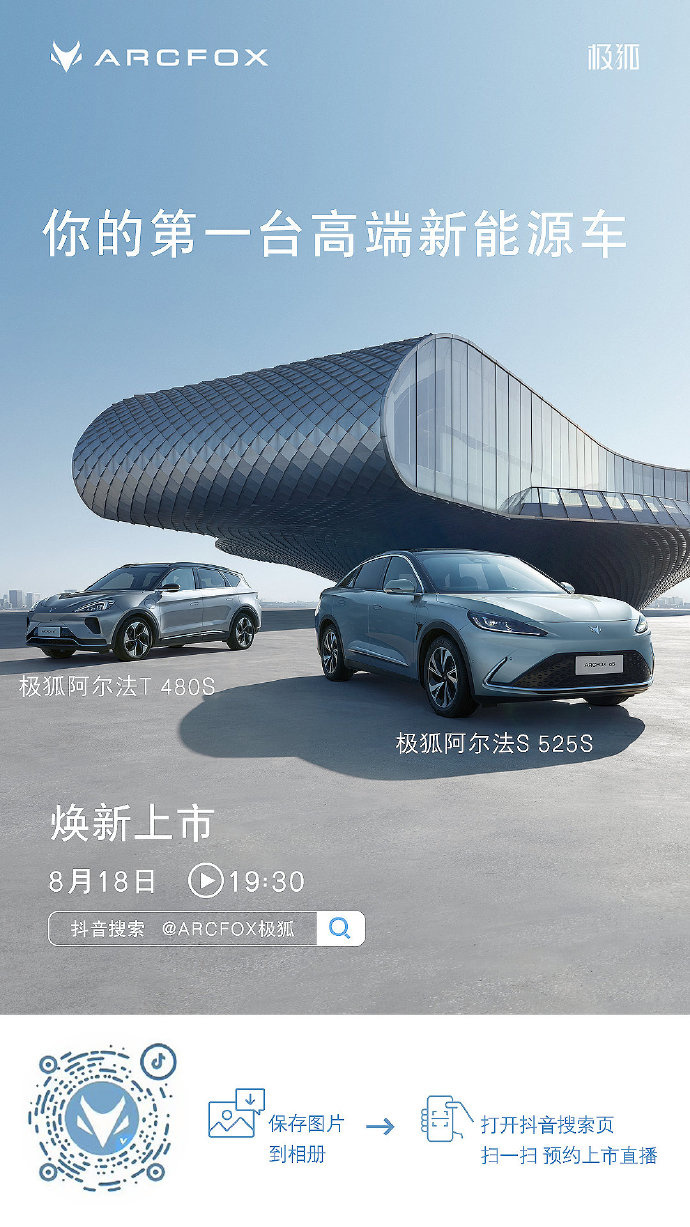 IT之家 8 月 17 日消息,北汽蓝谷现宣布,ARCFOX 极狐即将上新!极狐阿尔法 S 525S、极狐阿尔法 T 480S 将于 8 月 18 日 19:30 焕新上市。