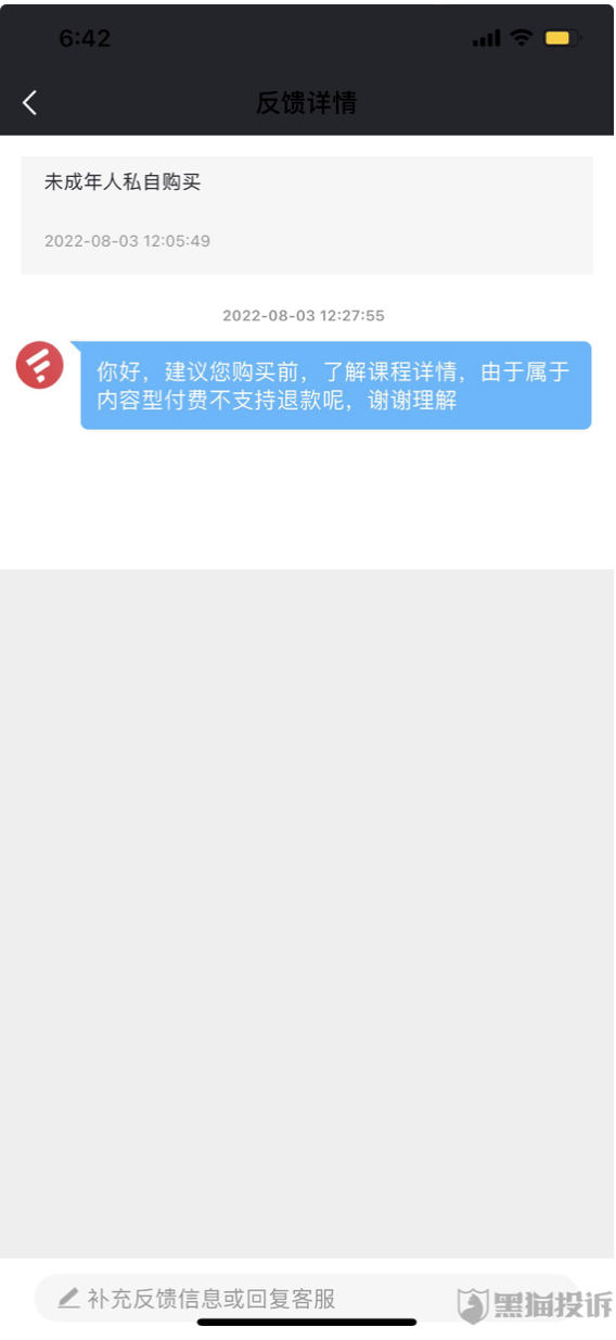 该投诉者表示:第一诱导消费者,加好友10天,就说今天有活动,有两个优惠选项,还另外赠送课程,升级vip可以抽奖等一系列好处,说可以永久留在班级,但成为会员后,说只有一年,这不是先诱导,后欺骗吗! 第二,霸王条款,消费者对你这个平台不满意,要求退款,刚买了还没一个星期,说这是虚拟服务不支持退款,问未成年私自购买呢,也说不可以退款,找不到客服去找老师,他说找不到,这不是霸王条款吗?后来我坚持要退我问客服在哪,她告诉我了,我在反馈说未成年人私自购买,客服回答说,本产品一经销售该不退款,还说让我以后看仔细,这直接影响了我的心情身心! 我要求退款,也希望严惩这个不规范平台!