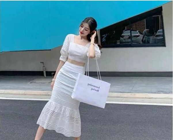 方领短款泡泡袖短袖,搭配同款的裹臀鱼尾裙,这是仙女的两款视感,虽然对身材的要求比较高,但穿起来确实不错!看来身材比例超好,搭配一双小白鞋增加休闲减龄的感觉!