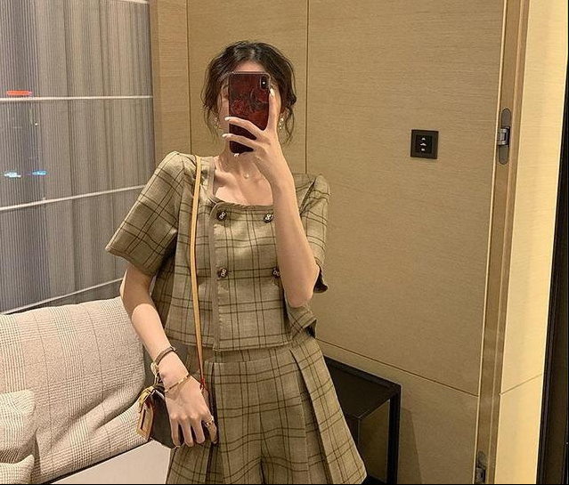 格纹西装,采用方领设计,会很好地展现锁骨,随意搭配项链能让你感觉很酷,充满高级感。裤裙设计,无论旅行还是上班,都不用担心跑出来。简单却不是简单,甜蜜和减龄。